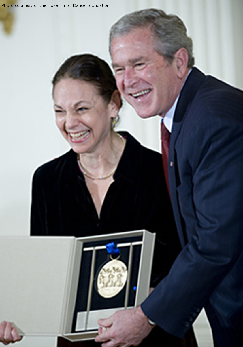 President George W. Bush congratulates Carla Maxwell, artistic director of the José Limón Dance Foundation of New York, as a recipient of the 2008 National Medal of Arts in ceremonies on Monday, November 17, 2008 at the White House. Photo courtesy of the José Limón Dance Foundation