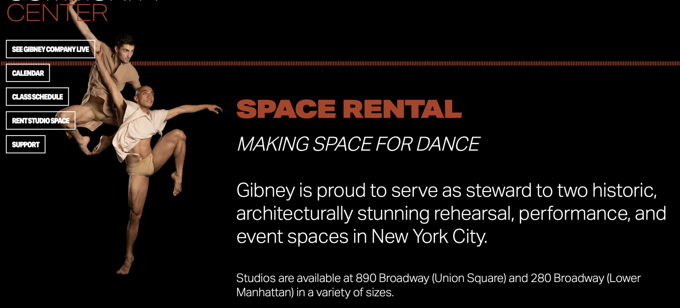 Graphic promoting Gibney's Space Rental Programs. Image via GibneyDance.org