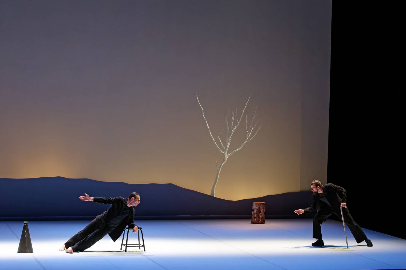 The curtain opens to reveal a small dead tree and a tree trunk in the upstage corner. A woman in white is seated, cradling a sapling. A man in black stands beside her with a cane in one hand and white owl perched on the other. In the foreground, three men in black pants and jackets roll up seamlessly from the floor to sit on stools. They spiral around slowly to kneel behind them as if in prayer.