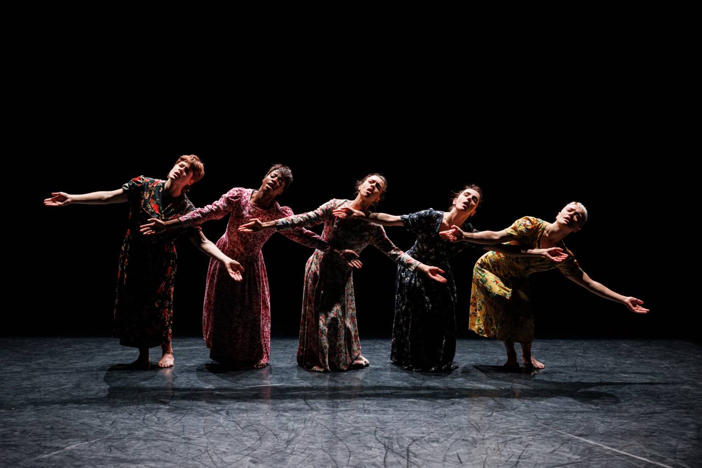 As New York Live Arts' welcome announcements begin, a pulsing beat becomes audible. All the lights black out. Five women — Océane Crouzier, Jennifer Dubreuil Houthemann, Jane Fournier Dumet, Jade Logmo, and Justine Agator — stand side by side serenely on the glowing stage. They wear long, floral, flowing dresses that cover their shoulders and knees.