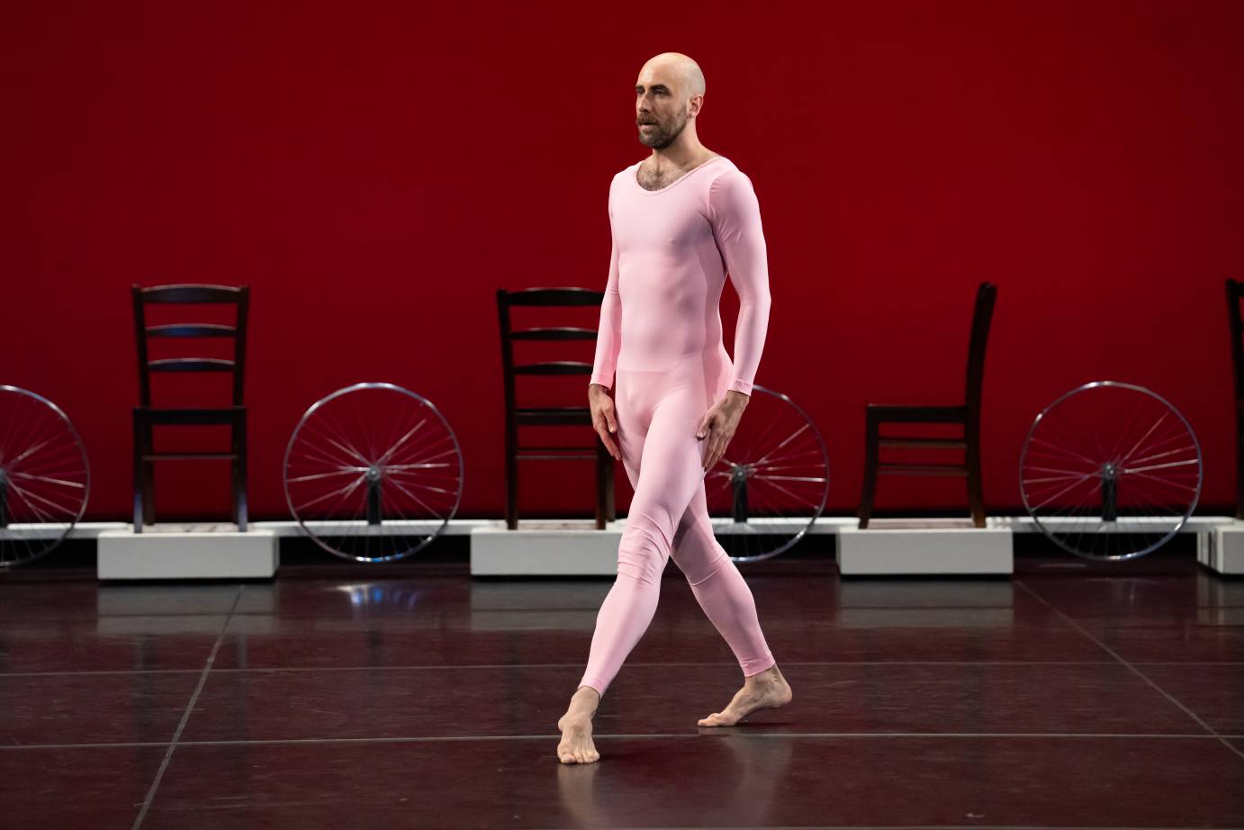 Following Set and Reset, Travelogue is a study in contrast and consonance, both between the choreographers and the breadth of Rauschenberg’s multifarious sensibilities. Again, the design introduces the dance as a train of alternating chairs and bicycle wheels travels across the back of the stage, with seated dancers cast in silhouette against a bright red cyc. Three musicians play John Cage’s Telephones and Birds, a chance operations-based score composed of recorded bird calls and automated phone menus, which lends melody and absurdity to the dance’s atmosphere in equal measure. Reconstructions of Rauschenberg’s patchwork sails descend to tickle the stage action, and a parade of colorful props and costume pieces play over a rainbowed array of unitards for the eight dancers. The ambling, episodic work marshals Cunningham’s wry, vaudevillian wit to color his rigorous phrases and structured scenarios, and the TBDC dancers rise to it all with daring sensitivity and unaffected grace.