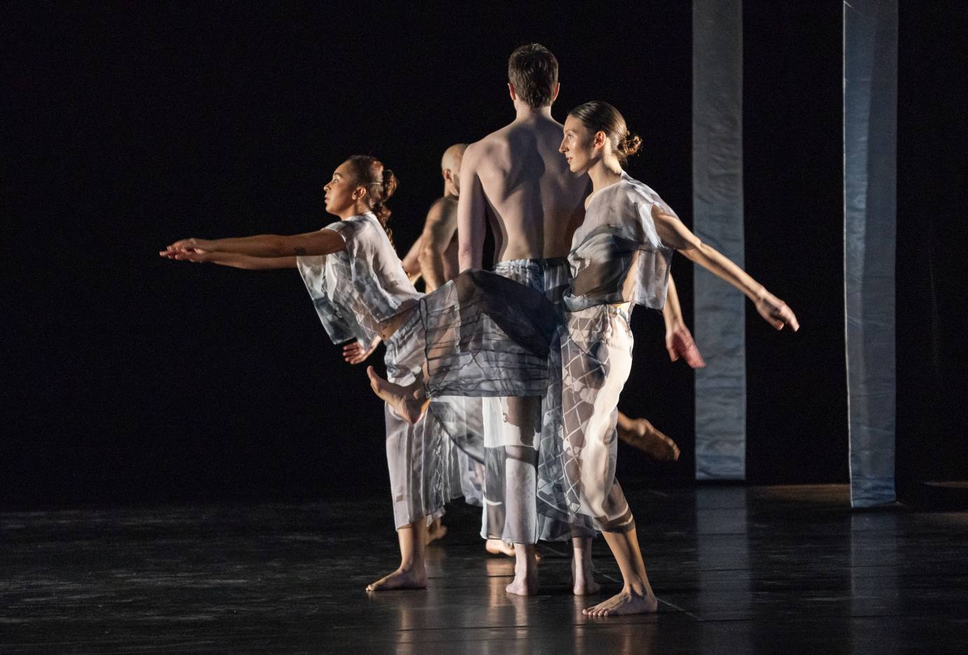 Set and Reset opens with a solo of sorts, not for a dancer, but for Rauschenberg’s design. A triptych of screens — a large rectangle flanked by two pyramids — flashes with layers of black and white films and photographs of patterns, people, street scenes, and cityscapes as a collage of sounds, words, and music harmonizes with its tumultuous multiplicity. The screens ascend slowly to hover above the stage space, which is framed by a series of long, sheer white panels in lieu of traditional theatrical wings. With the scene set, dance and music fall into motion with an ever-shifting density of composition that converses with the photo projections that continue over the dancers’ heads throughout. While it’s difficult to tear my eyes from the dancing for even a moment, Rauschenberg’s ghostly images — restated on the dancers’ diaphanous costumes — animate an upper periphery as the engine of the dance, just as the iterative cascades of rhythmic grounding in Laurie Anderson’s Long Time No See serve as its timepiece.