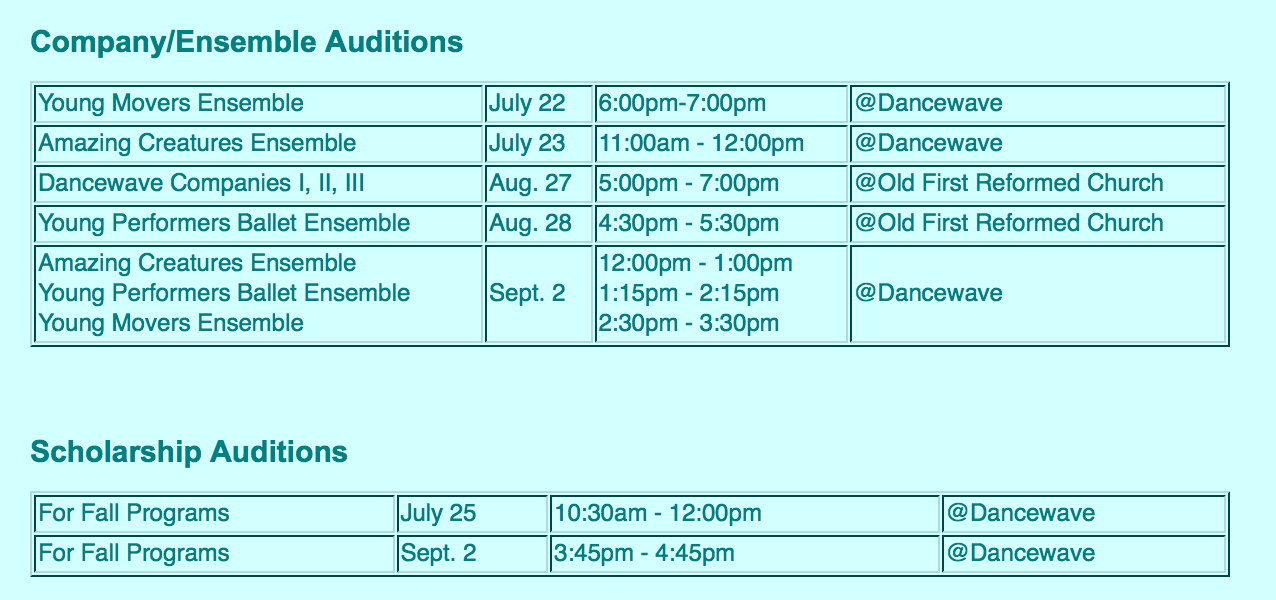 To sign up for an audition time, send an email at school@dancewave.org or call 718-522-4696