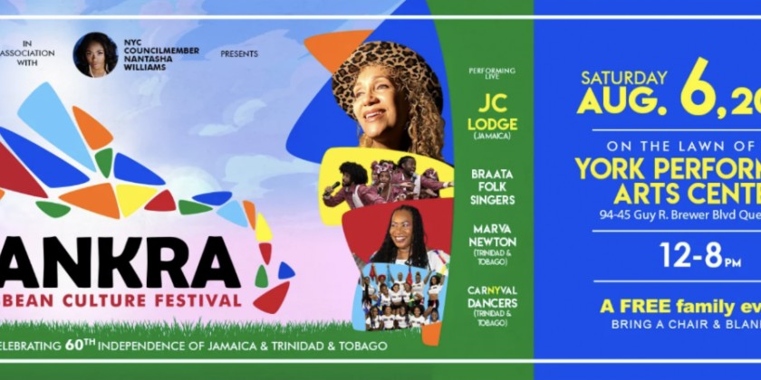 Braata Productions presents Bankra Caribbean Culture Festival celebrating the 60th year of independence of Jamaica and Trinidad & Tobago on Saturday, August 6, 2022, 12pm-8pm, on the lawn of the York Performing Arts Center, 94-45 Guy R. Brewer Blvd, Queens, NYC. The event is free, but donations are accepted at braataproductions.org/bankra2022.