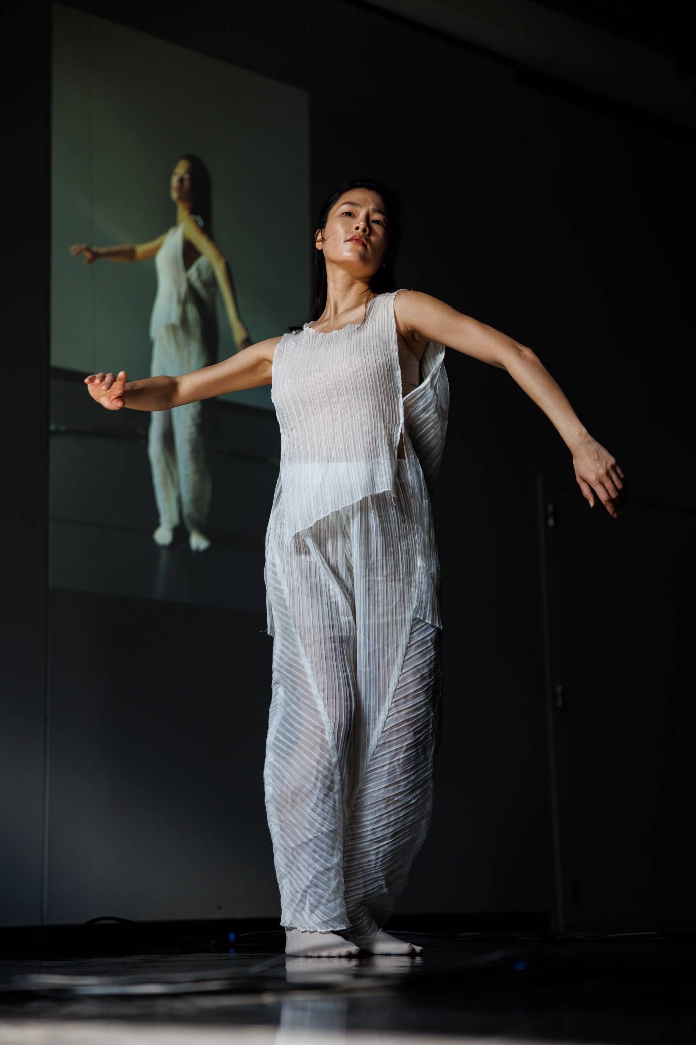 Moon’s choreography evokes impermanence and transformation as she meditates on tangibility in cycles of life and death. She dances with herself, her loved ones, and her ancestors in mind; she is also a few months pregnant. As her customarily lithe frame fills in with maternal life, she deepens into her precise and serene qualities with clear virtuosities of weight and purpose. “I feel like a hippo,” she admits, yet she is elegant and grounded as ever in a diaphanous costume of delicately-pleated white pants and tunic. She steps into the circle and slowly fills it with a spiraling walk, treading out the breadth of possibility in the small space. Her heels pulse a soft rhythm underneath the swirling flow of her torso and arms, ripples and waves punctuated by the muted percussion of her sock feet. Tense fists dig through the air and delicate fingers trail symmetries as she slips to her knees, the light growing dim.