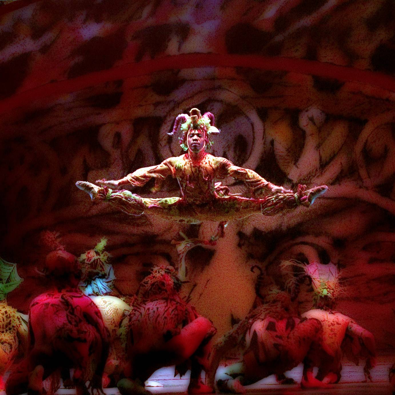 For a Firebird unique to DTH, in 1982 Arthur Mitchell envisioned it in a tropical forest. He hired John Taras, a former ballet master for NYCB to choreograph it. Naturally he asked Geoffrey Holder, who had created the celebratory Caribbean/African Dougla (1974) for DTH, to design the sets and costumes. Author Jennifer Dunning describes the thick, curling vines and “splashy insouciance” of the backdrops. The Firebird wore what looks like a bathing-suit in front, topped off, or rather bottomed off, with a pert tuft of tutu. It is a cacophony of color: “Three shades of red, a little bit of magenta, shocking pink, and orange,” said Holder. “The combination makes the red fluorescent.”