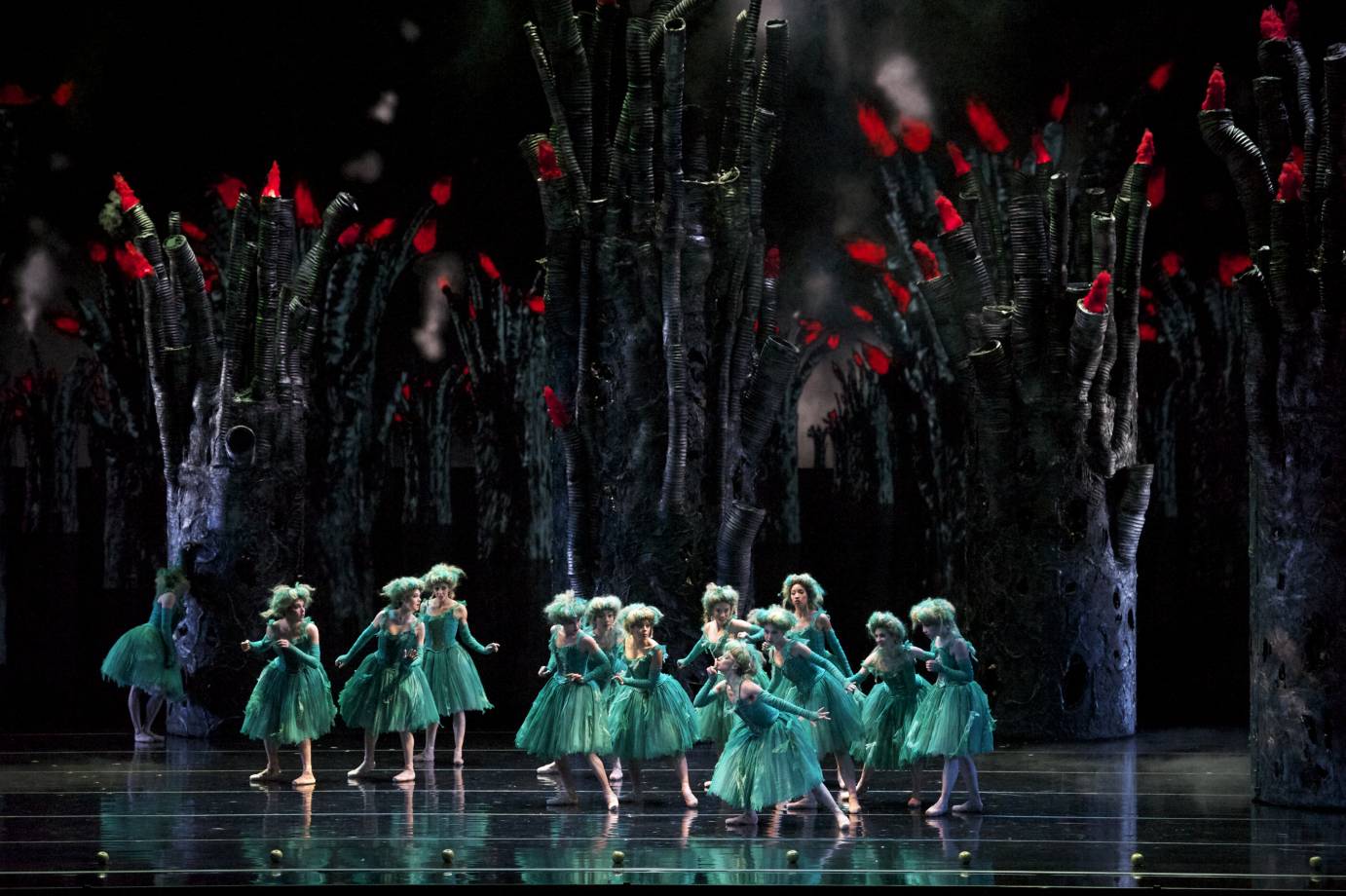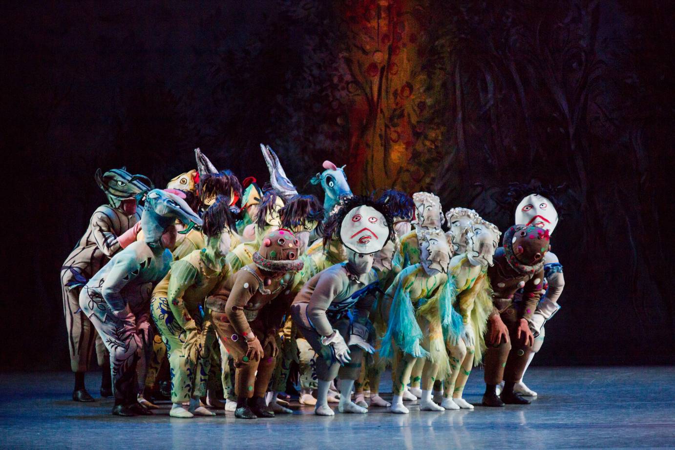 In 2012, Ratmansky collaborated with Russian designer Simon Pastukh to reimagine The Firebird. The late Joan Acocella called it “wonderfully weird” in The New Yorker. One of the weird things is that, by the time we see the firebird in her bold scarlet tutu, we’ve seen a flock of firebirds in the same scarlet tutu. Also, when the maidens are released from Kastchei’s evil spell, they all wear the same dress and same platinum wig (costumes by Galina Solovyeva). To my eyes, the use of conformity dampens the magic. That said, Ratmansky uses the full 47 minutes of the score to tell the story in a rich and surprising way. I found the Berceuse scene, which Ratmansky made into a quartet of sorrow, very moving. And Pastuch’s sets — particularly the burning tips of the ancient trees — hold bizarre and delightful surprises.