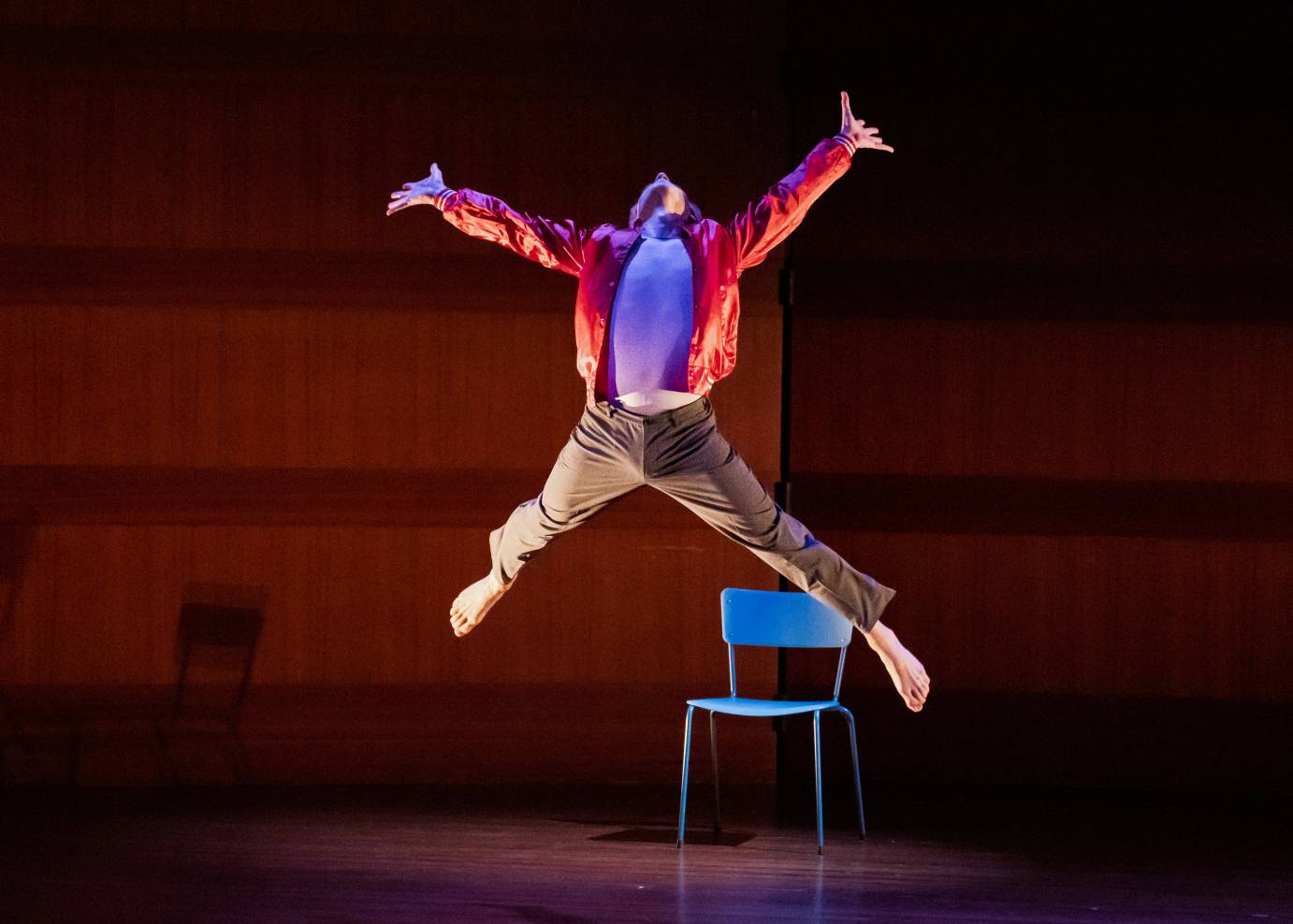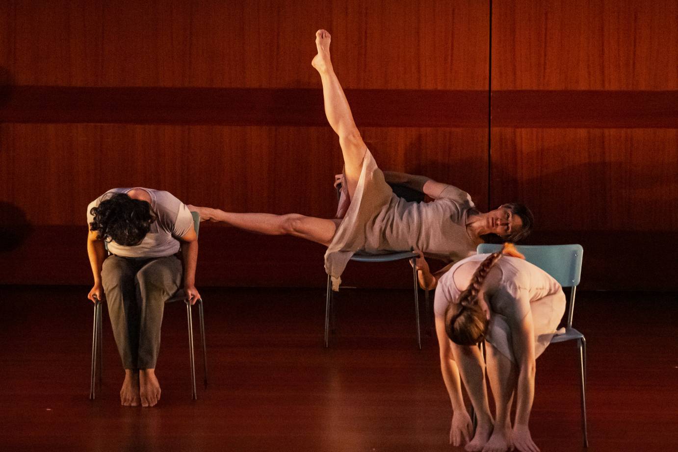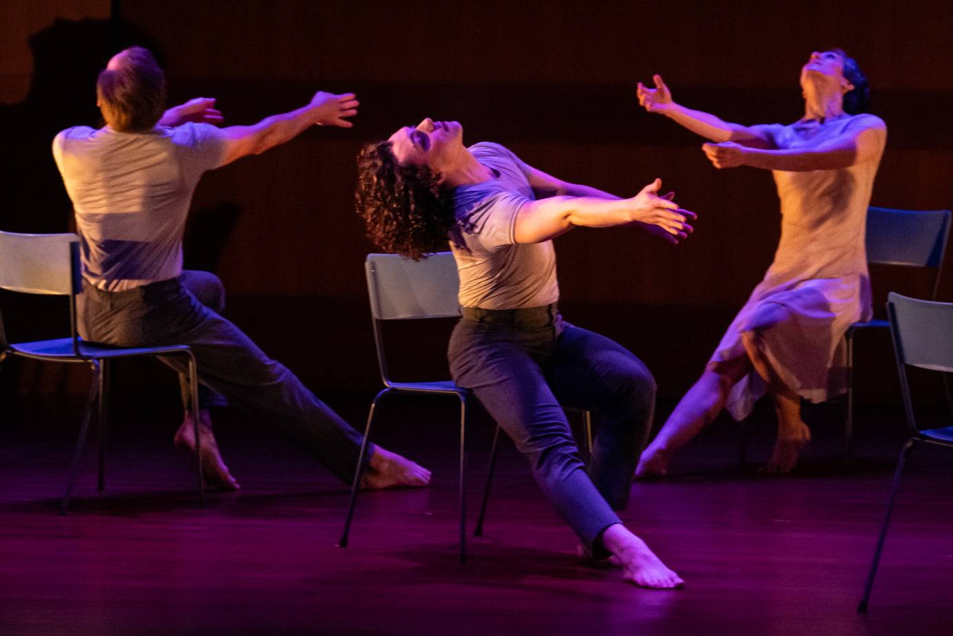 In this performance, the dancers channeled Sokolow effortlessly, revealing deep theatrical range and a varied mix of techniques. "Escape," danced by Ilana Ruth Cohen, portrayed a heartbroken, melancholic woman waltzing in soft, curving shapes; while "Going," interpreted by Brad Orego, displayed a restless character, bouncing with frenetic jumps and dynamic baseball slides. Mikey Comito's yearning solo, "The Dreamer," featured slow-moving gymnastic strength moves and deep torso contractions, in contrast to Margherita Tisato in "The End?," whose emotional intensity and fevered gestures drew on physical theater and mime tradition.