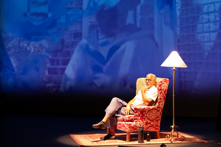 Roussève’s struggle to engage with his emotions establishes itself as a prominent throughline in the work, guiding the narrative forward with his musings on visibility. He tells his stories directly to the audience, but as he starts delving into vulnerable waters, he chokes up. It’s best depicted as he talks about his struggle with lipoatrophy, a condition where someone experiences abnormal loss of body fat, while living with HIV. He uses humor as a coping mechanism, jokingly comparing himself to a skeleton. As his emotions spill around, he struggles to speak and turns the direction of his chair away from the audience to remedy his discomfort. He’s disengaged. As he looks at the upstage corner, he shares a story about how his ex-husband, Conor McTeague, yelled at him to stop talking so badly about himself amid his search for antidotes to his lipoatrophy. McTeague’s outburst was a sign of his love, and Roussève’s confrontation with that truth is what makes it difficult for him to engage with the audience. This beat in the story cements his main conflict of learning how to love and be loved.