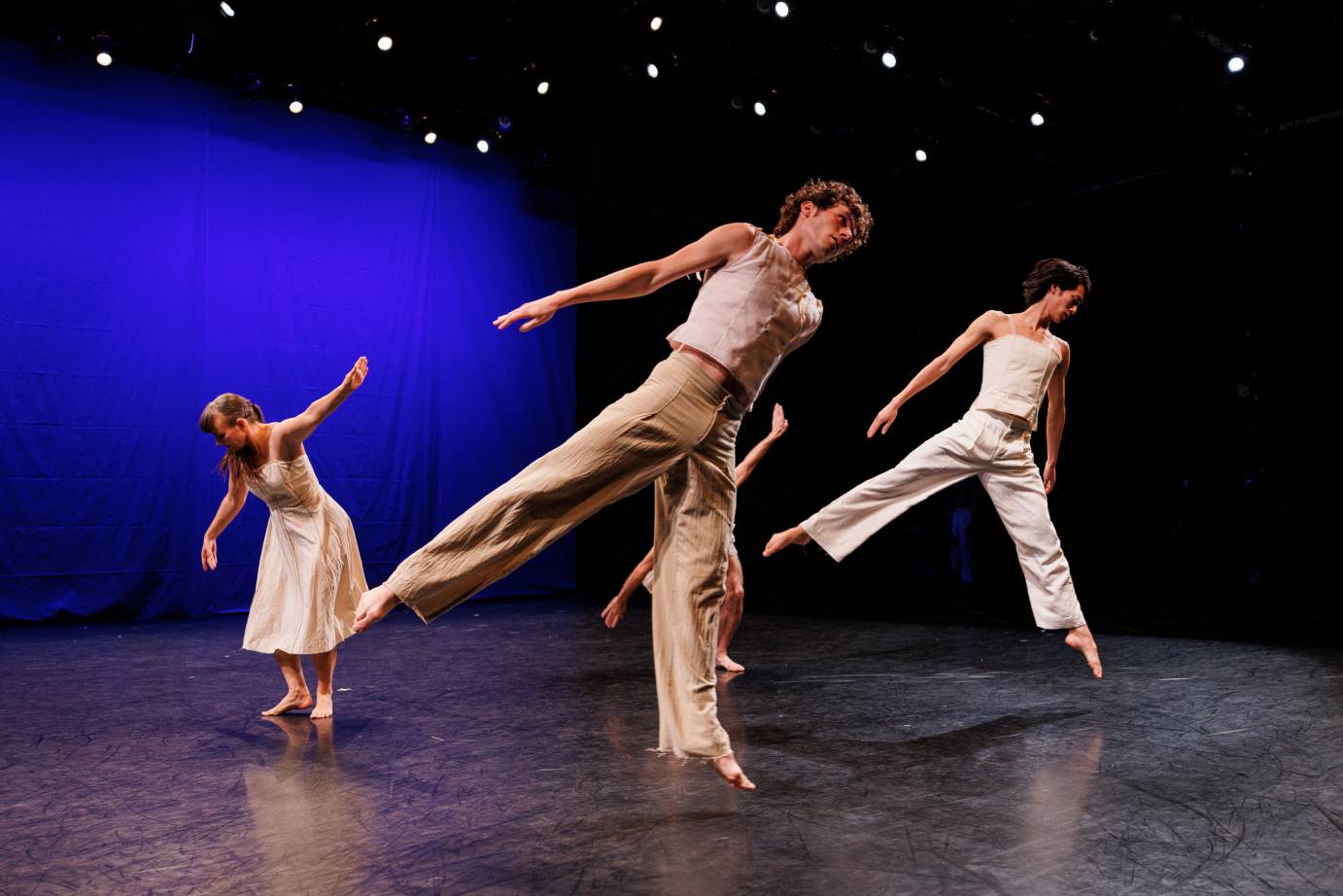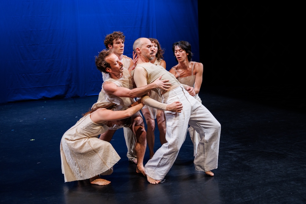 The musical tapestry, also by O’Connor, buoys the dance along with softly-plucked strings, echoing chimes and horns, plaintive voices, and passages for piano and string quartet interspersed with sounds of wind, water, and waves. Clad in Reid Bartelme and Harriet Jung’s beautifully-draped cream-colored costumes, the dancers glow in Michael O’Connor’s subtle light. Backed by a hum of indigo or a wash of sky blue, they are revealed in clear brightness, their gazes bold and direct, only to shift into a dreamy yellow distance as they turn inward. Their world is an unstable one, equally beset by crisis and tempered by comfort, yet they find assurance in themselves and one another. With soft hands they touch their own bodies, touch the air around them, and reach out to touch each other, tuning their attention through permeable boundaries: inward and outward, self and other, dancer and dance.
