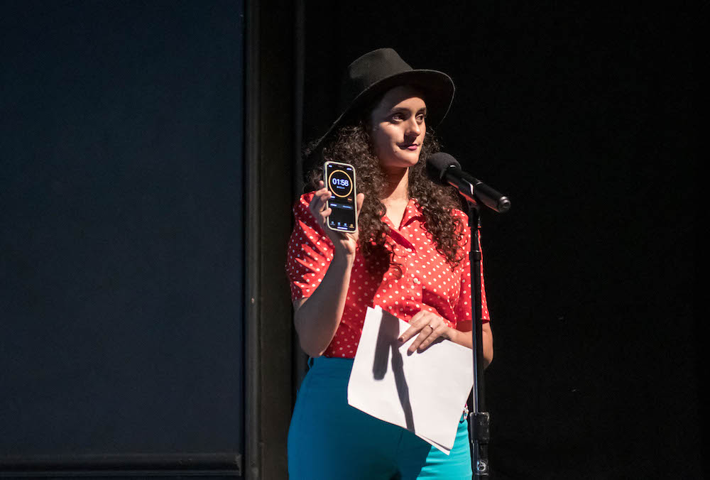Arthur Aviles in an original costume by Liz Prince while presenting Super Maeva de Oz; photo by Paula Lobo