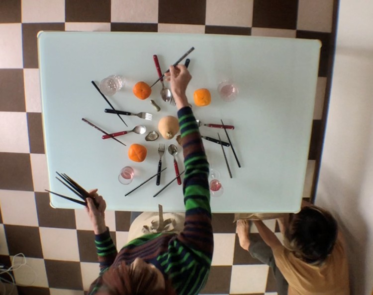 Rogoff’s The Yamanakas At Home , a work-in-progress created with Mei Yamanaka, juxtaposes the mundane with the arcane. Mom and Pop Yamanaka drink tea, watch television, and groove around their living room to Scott Greenblatt’s infectious “Can’t Sit Still.” A lone soldier in fatigues and platinum blonde hair moves through and around their safe space, army-crawling over stairs and peering through windows. Who this entity is remains elusive, but Mom and Pop Yamanaka sense something or someone is afoot. Ritualistic circles of rice appear over and around the family and their objects, such as photos or delivery boxes or, in one instance, the parents as they sleep. They sweep up these esoteric symbols, but like a ghost, they always come back.