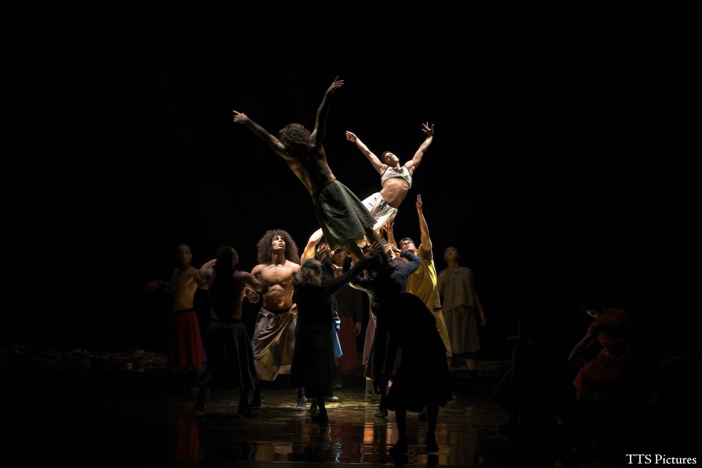 Spotlights illuminate the space that just opened, and soon different solos dart in and out of the light. The play between light and darkness is mesmerizing. Is it daytime and nighttime simultaneously? Are we underground, and then atop a high desert plateau? People assemble and lift a woman wearing a bra-like top on their shoulders. Another person gets lifted, and the two circle each other on a higher plane. Beams of light from every direction converge on a central circle. A small group gathers for a folk dance that reminds me of a Spanish Jota. Others exercise martial arts.