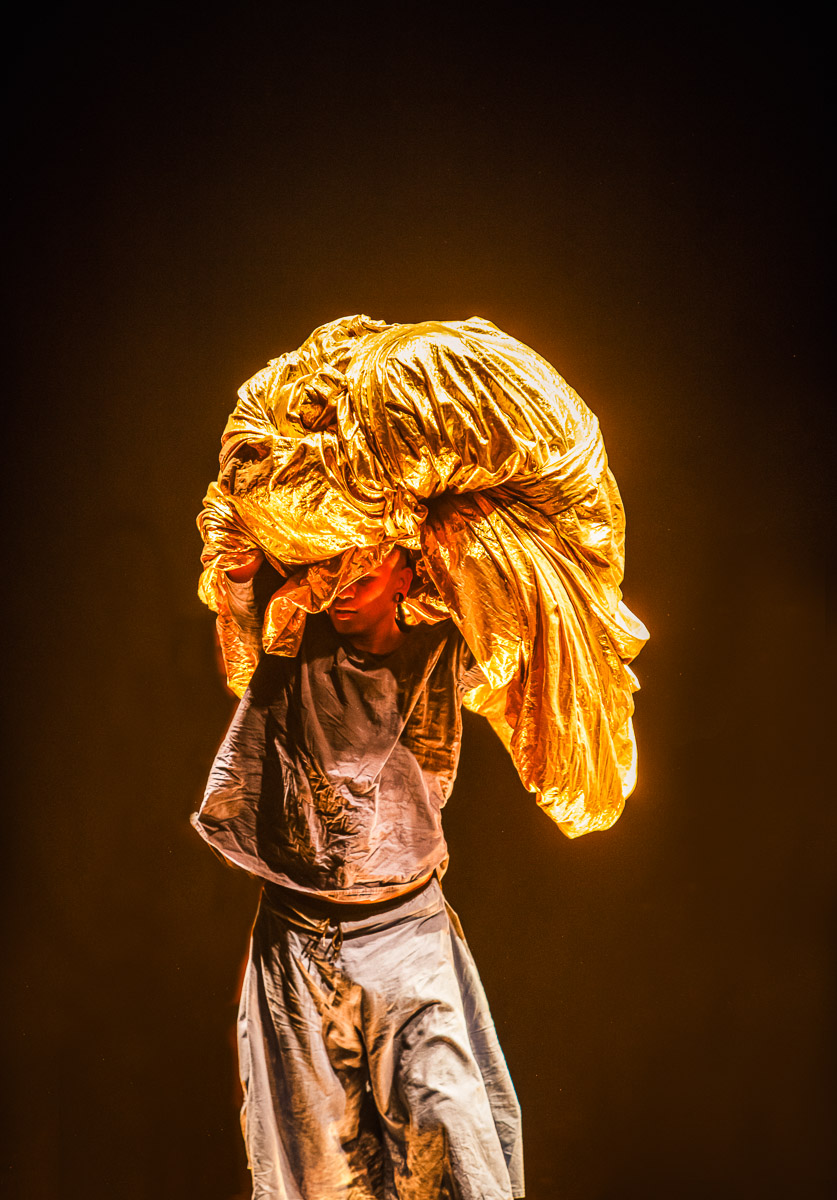 As the soundscape shifts, so does the temperature of the show. One woman slowly pulls a golden fabric that had been placed inconspicuously across the back of the stage all the way to the front, so it covers the whole space. She lifts the cloth and places it over her, looking like a Madonna with a golden veil. The rest of the group steps on the fabric in a line upstage, with everyone but the bearded man looking at her. He happens to be slightly ahead of the others, with his gaze off into space. The woman then steps on the fabric, and the group crouches down and pulls it in such a way that they magically transport her to the bearded man.