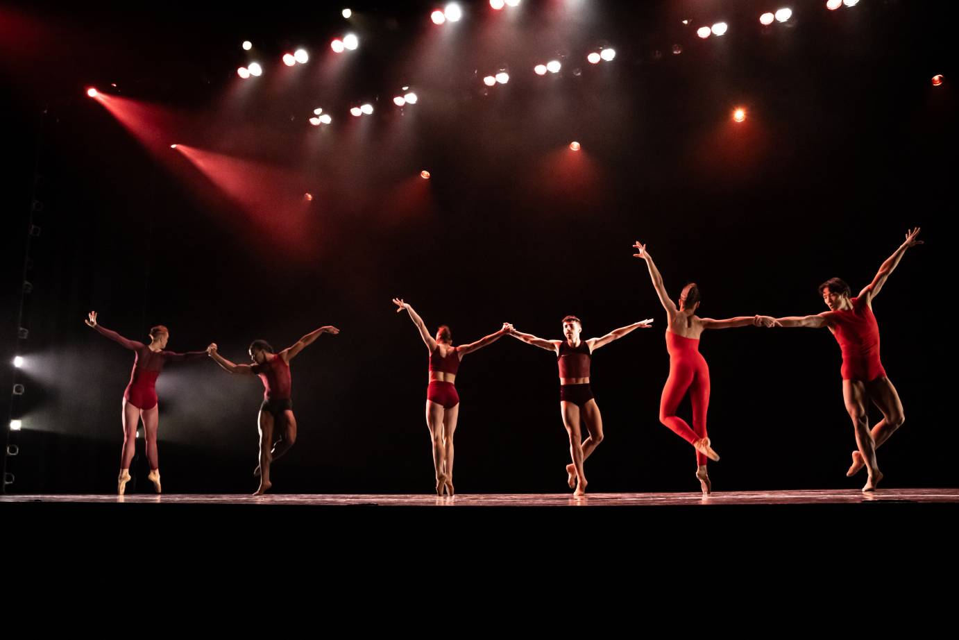 Young Lovers, choreographed by guest artist Houston Thomas is set to music by Jeff Buckley, Tarika Blue, India, and MAW. Thomas, a former soloist with the Dresden Semperoper Ballett, brings a calm, cool, edgy vibe to the stage for the first time. The dancers’ dark matte red unitards and cropped velvet costumes compliment bursts of deeply vibrant red, white, and royal blue lighting. Quick fouettés and chaînés feel effortless, gliding like butter across the floor. We witness moments of pause and breath in Thomas’s choreography that allow stillness and anticipation to fill the air between sequences of movement.