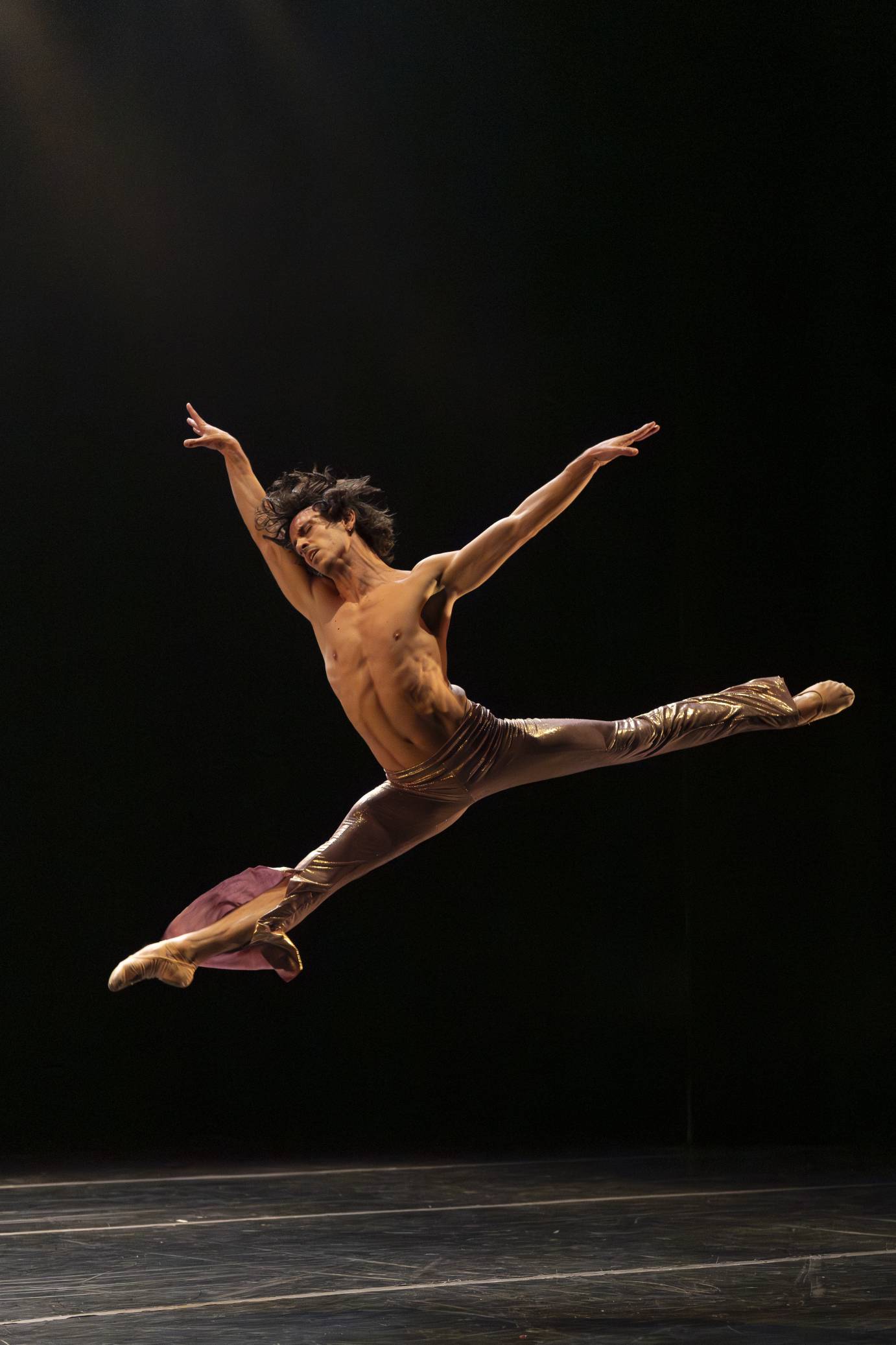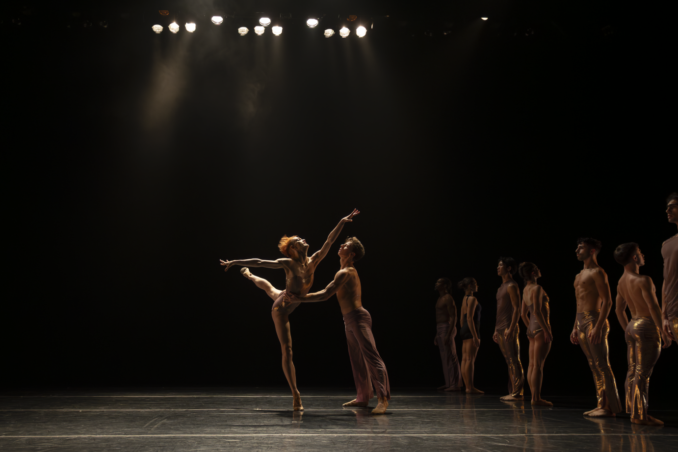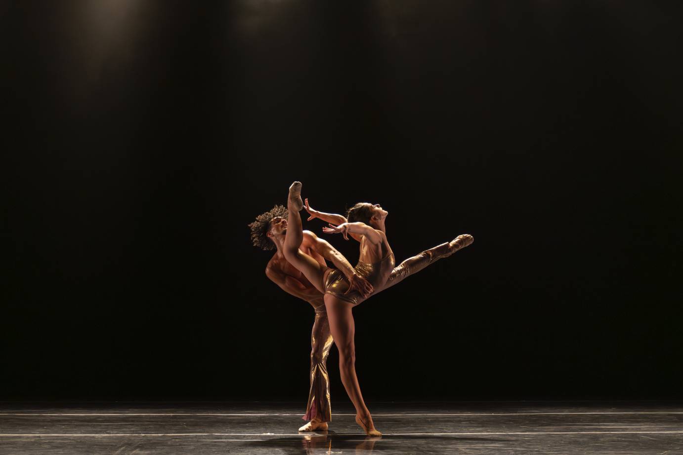 Imagine Joy, choreographed by Rhoden, opens the program in a dazzling, romantic way. Dressed in metallic rose gold leotards and bodysuits, the full company of 16 dancers appears in flat shoes, which ground their movements for turning and landing jumps. As an audience member, it's easy to connect to the immediacy of their intertwining partnered sequences, which are built on trust and intimacy. As soft piano notes ring, the dancers seep into deep à la seconde lunges and pliés with complete focus and awareness of their bodies. They float and glide, at times releasing their joints in a deconstructed, liberating manner.
