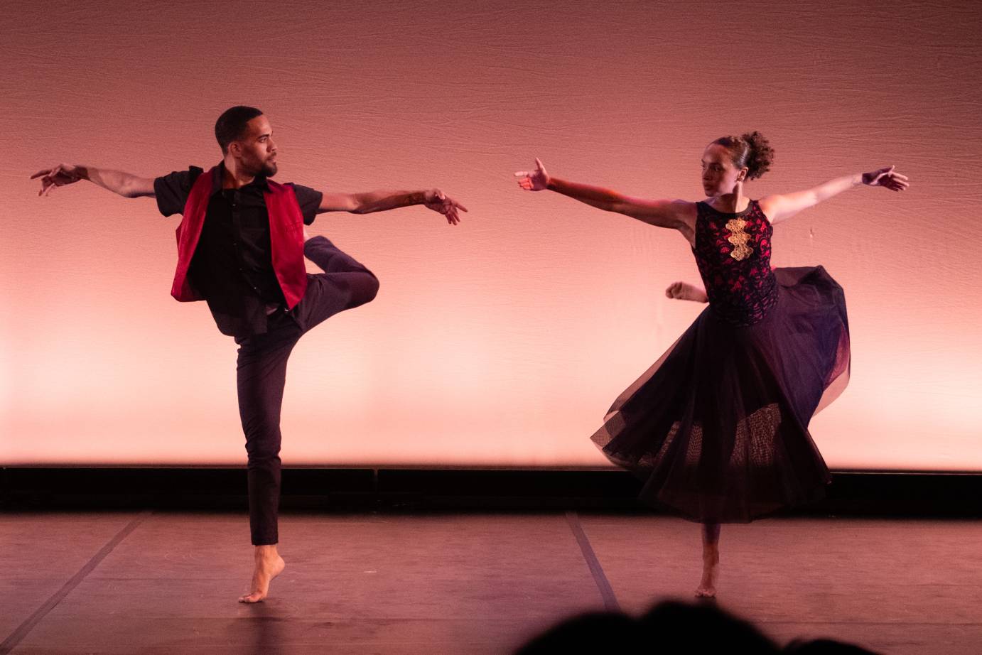 Whipping her skirt through the air with each spiral and extension, Vargas glides effortlessly, her lifted chin and focused expression reveal a deep desire. Demetrius Burns joins Vargas performing the same movement vocabulary, but offering a more grounded interpretation. Their duet evolves into a beautiful conversation of contrast and complement.