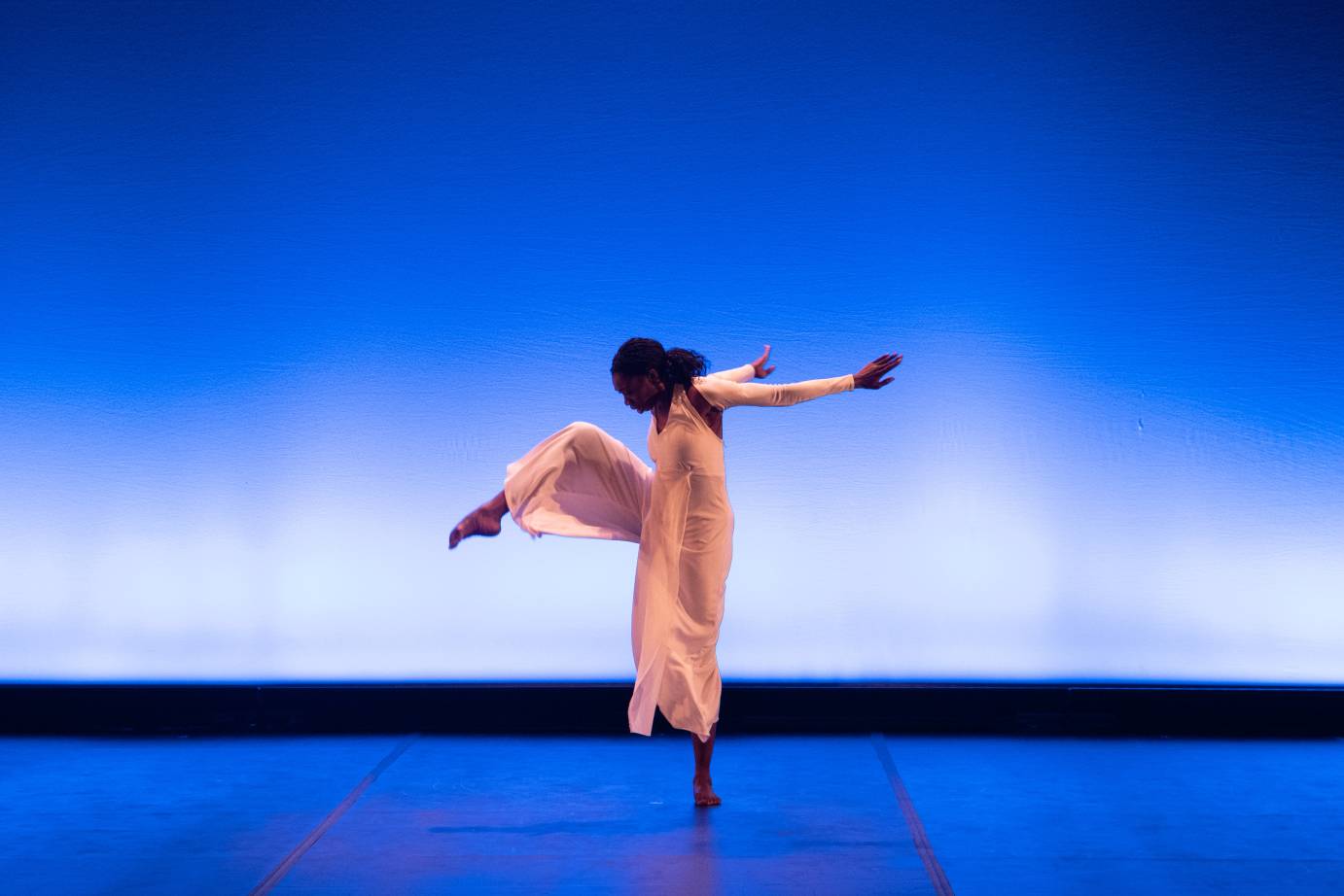 Khalia Campbell takes the stage next in a solo from Brown’s seminal choreography Grace. First appearing in silhouette before stepping into the light, Campbell emerges framed by a soft blue glow, clothed in white. She is statuesque, divine, and poised. Grace traces a goddess’s journey to Earth as she spreads spiritual mercy and guides earth dwellers toward heaven. Campbell’s gentle side-to-side steps, wing-like arm curves, and subtle shoulder undulations create an atmosphere of quiet power which invite the audience into her realm.