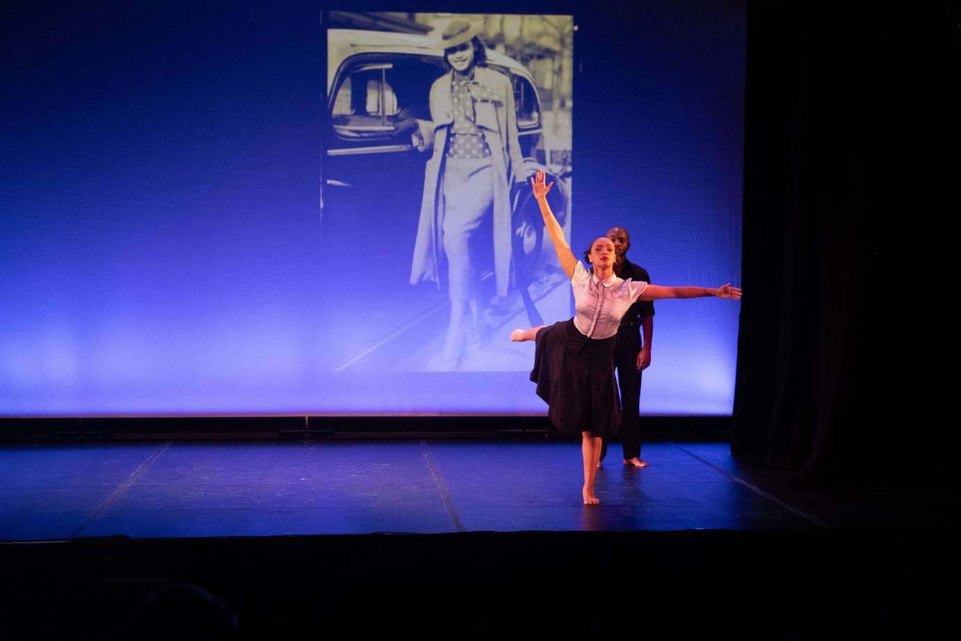 At first, suspended jumps contrast playfully with the high kicks and fast footwork. A striking shift occurs when the lights dim and the dancers emerge one by one, walking with grounded heaviness, their gestures indicative of struggle and the weight of history, as they contemplate Garvey’s death.