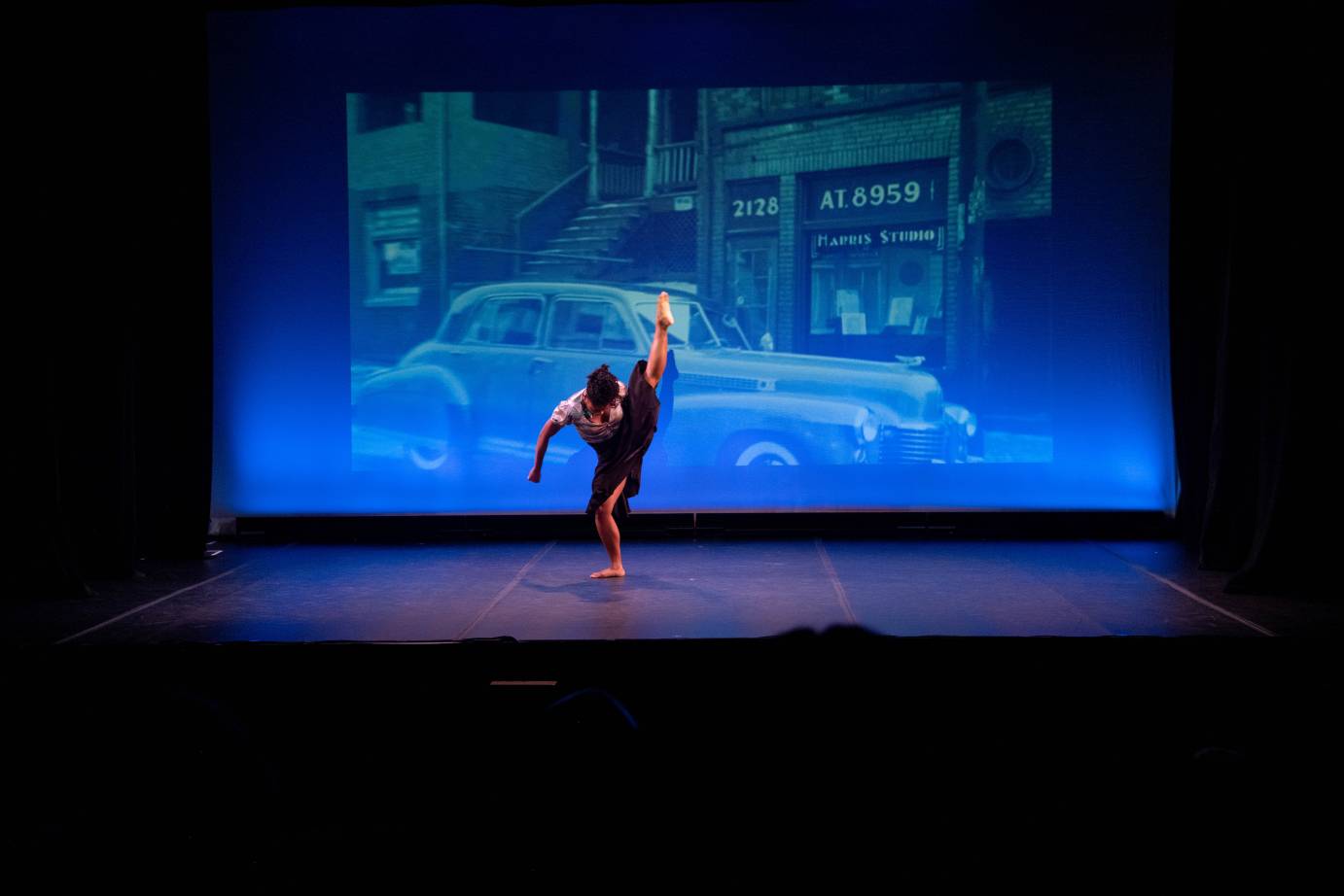 A plethora of jazz and soul artists, including Lena Horne and McCoy Tyner, provide the soundtrack. The lightness of the music’s lyrics “like someone in love,” and “old friend” support a playful atmosphere. Projected images of children soften the stage with nostalgia, innocence, and joy. The dancers repeat turns that somehow feel fresh each time they’re performed. It’s as though the movement radiates from the deepest part of each artist. One Shot closes with the dancers kneeling before a portrait of Harris in a moment of reverence.