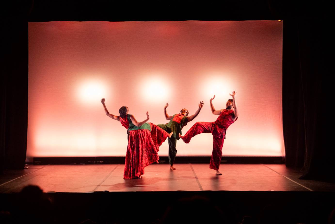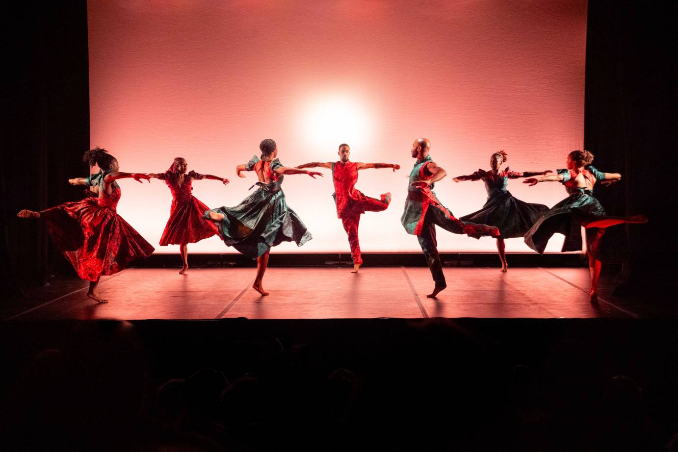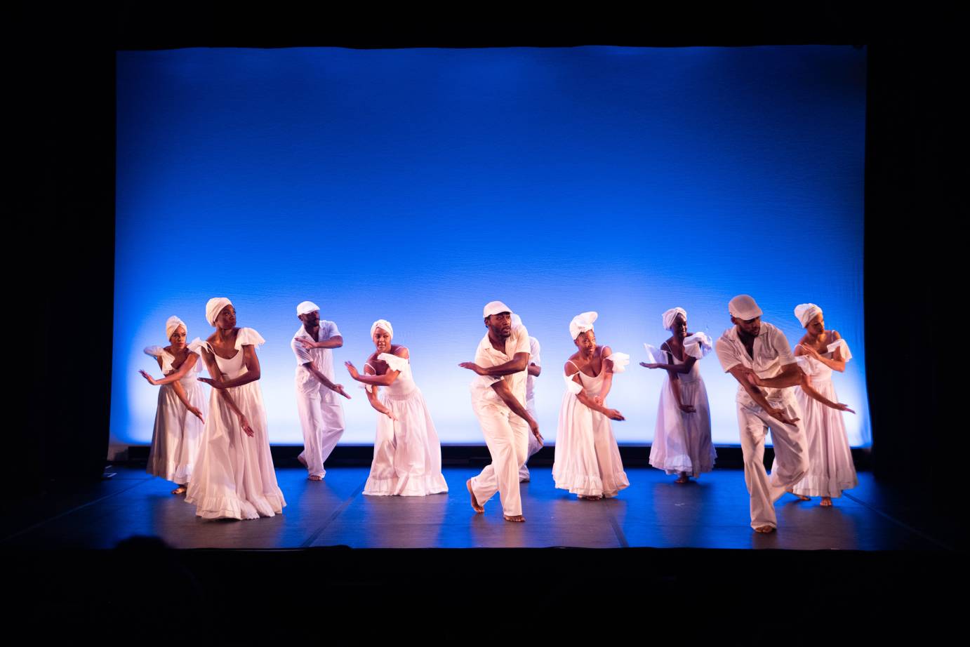 As the lights rise again, the performers appear dressed in flowing white outfits. The color white introduces a visual language of purity, healing, ancestors, and passage into the spiritual realm. Shaking and rattling their fabric in unison, they fill the stage with motion, rhythm, and triumph.