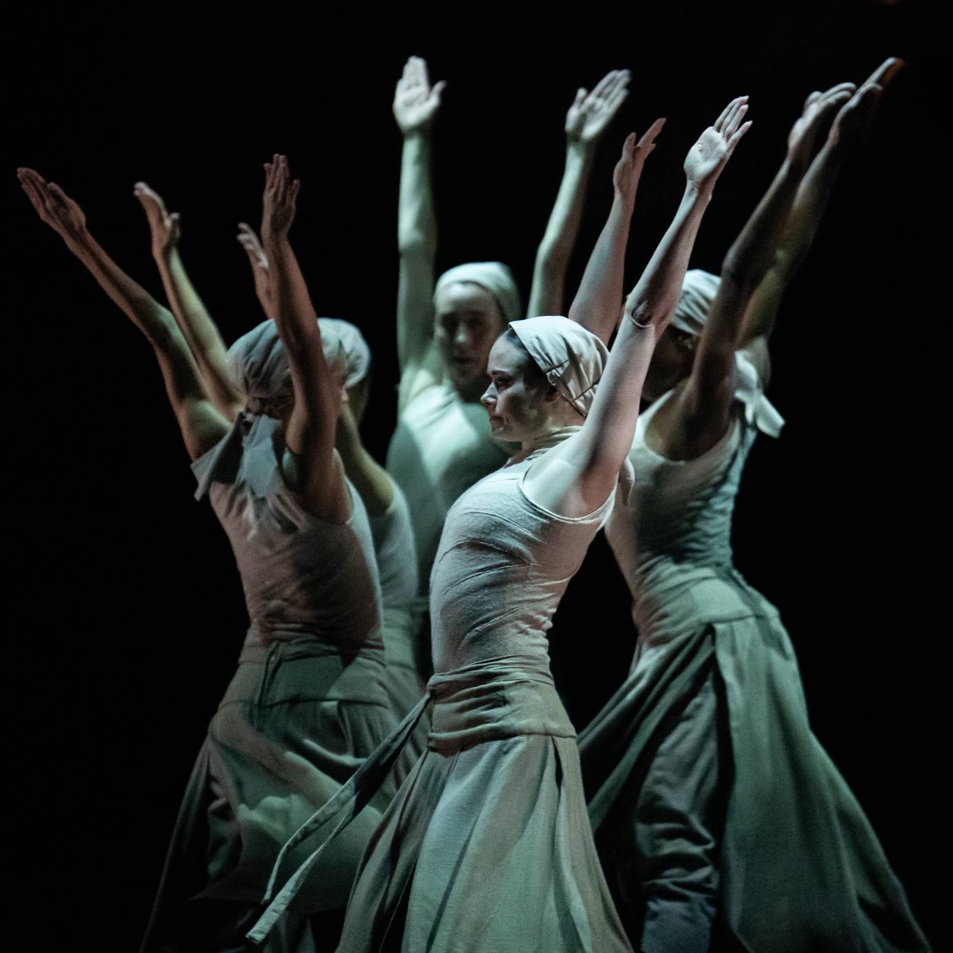 As the story develops, the men in the group desperately ascend the mountain to its other side; the atmosphere suggests they're in the midst of war. The women, left behind, fend for themselves, dancing determinedly in their community for survival. Amidst a stage filled with powerful females, Khan shifts our focus to a lone soldier descending the mountain, returning from battle. As the group dissolves, one woman, (Katherine Barkman) and this soldier (Victor Prigent) make love, through dance, as if they are the last two people on the scorched earth. A far off scratchy recording in the background plays to the tune of Auld Lang Syne, "We're here because, we're here because, we're here because…." emphasizing the desolation.