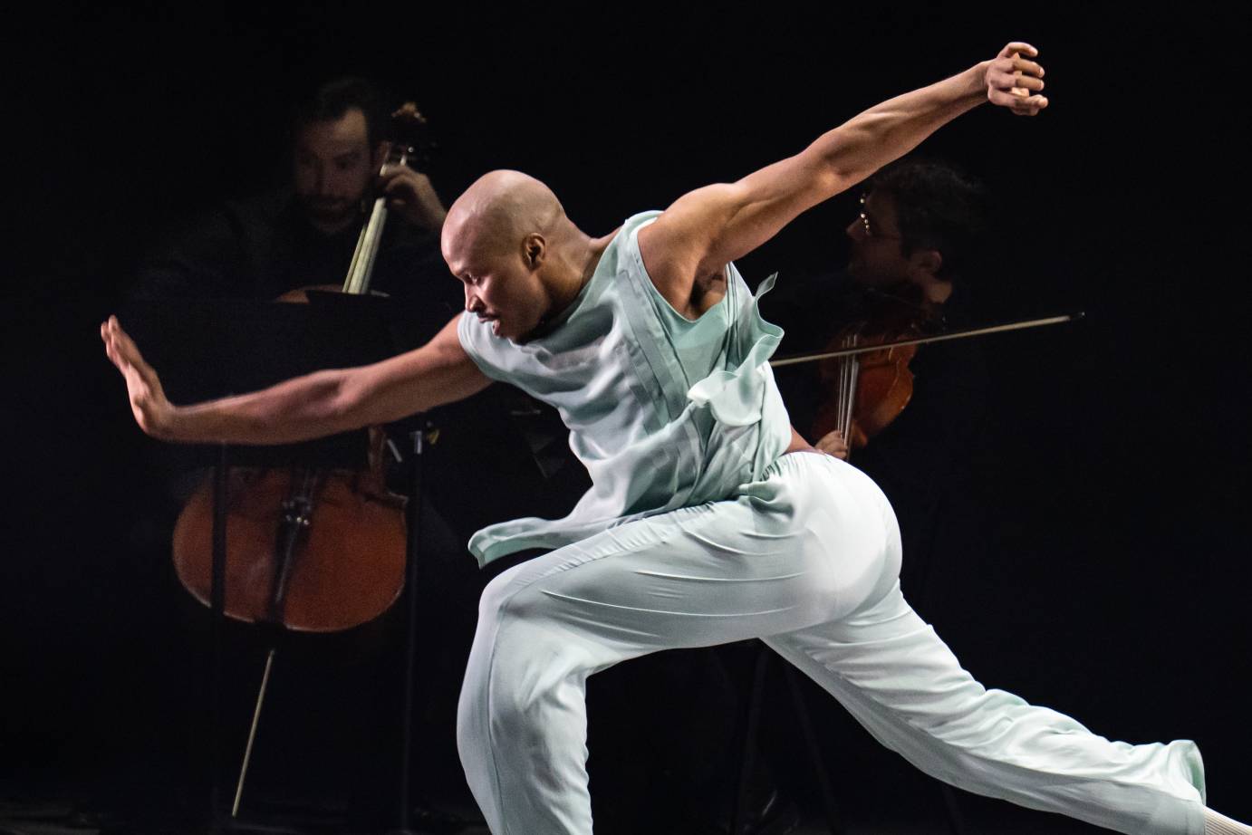 Fully in their element, the two men appear to swim through the air, commanding it. Carolyn Shaw's music played live on stage by the Attacca Quartet; vocalist Raquel Acevdo Klein's lyrics riffing Shakespeare's "A rose by any other name would smell as sweet"; the duet between Mearns and Roberts, a poignant contrast of her lightness of being with his unwavering solidity; the ticking clock in the score towards the end as Mearns walked toward a beam of light, are all intriguing, but, how these elements fit together and what they were trying to say, I wasn't sure.