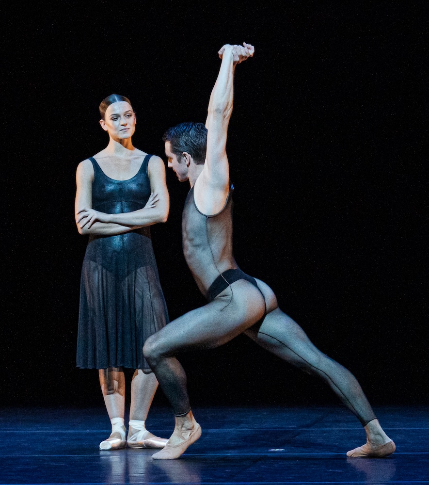 Mackenzie Brown and Martí Paixà at first compete with one another before a tender adagio brings the neoclassical Two Pieces for Het to a close. Circling one another with flexed feet doesn’t amount to revolutionary invention, but these etudes to music by Estonian composers Erkki-Sven Tüür and the overused Arvo Pärt hold one’s interest as they are executed with poise.