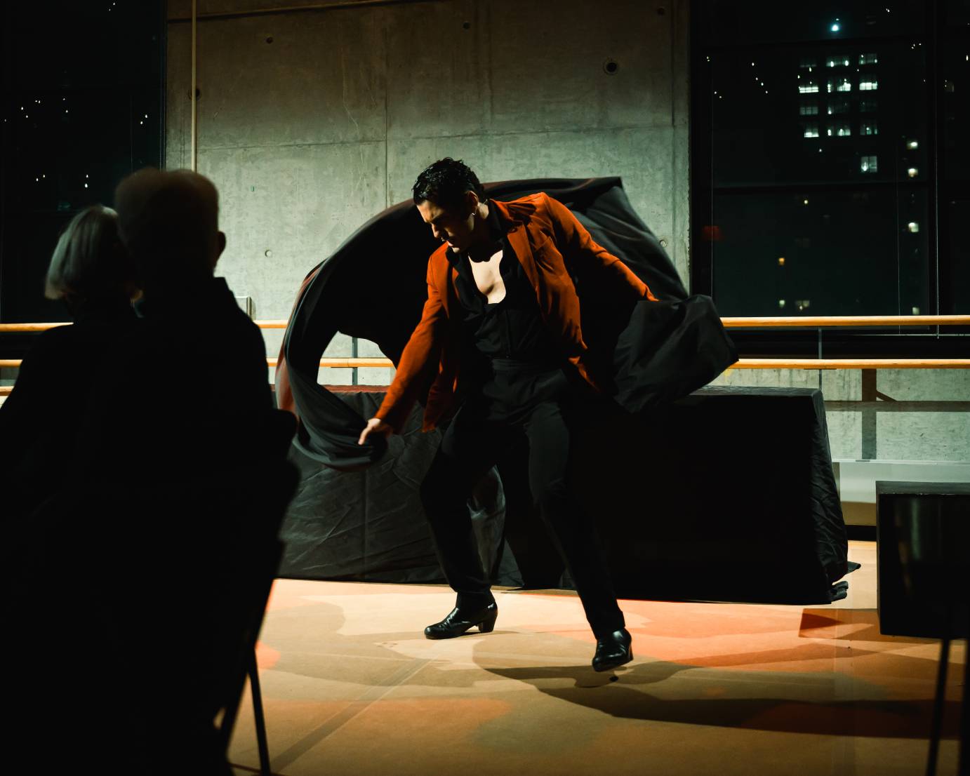 Alberto Sellés swirled a black cloth off a long table with a playful swagger, drummed his feet on a cajon (only slightly bigger than a dime), then continued his tangos on the table. Plopping down on the table with baby-faced dancer Juan Tomas de la Molia, he started a metronome ticking, hypnotizing us. With that, began an unforgettable duet for metronome and guitar by the young prodigy José Fermín Fernández, perched on the ballet barre, with his back to the NYC skyline. Playing with classical detachment, he mesmerized us with his grace and precision. Since these performers were rarely more than 15 feet from the audience, their intensity felt tangible.