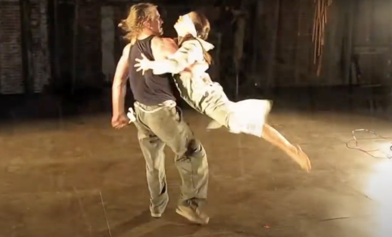 The nuts-and-bolts rigging is more impressive than the digital stuff; and—dare I say it?—this piece might appear to better advantage live, where an awareness of gravity would enhance our appreciation of the dancers’ flying stunts. Yet the best moments of InsectInside have nothing to do with technology of any kind. They’re not the buggy bits, but the human bits: when Fuhrman turns, smiling joyfully, as an attentive Rhem wraps her in a cozy shawl; when Rhem tires of swinging her and clutches his head in annoyance; when he unfastens her harness, and she shrinks away from him, broken and unhappy.