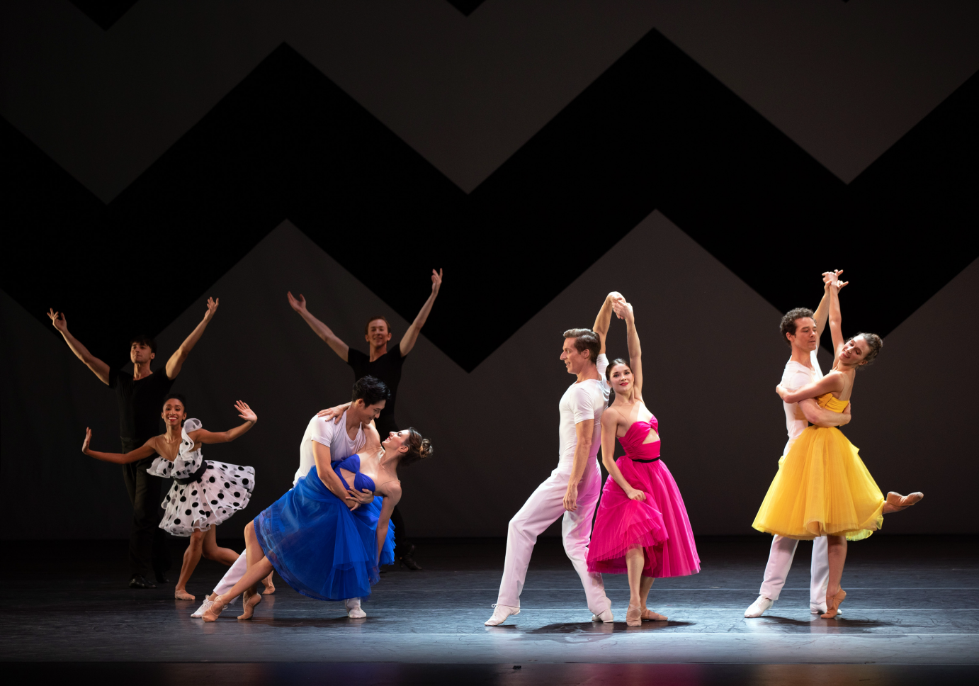 Principal dancer Cory Stearns takes a star turn in choreographer Jessica Lang's world premiere ZigZag to songs recorded by Tony Bennett. With his matinée-idol looks, Stearns leads an ensemble in his reverie "I left my heart in San Francisco," and carves out memories with every move on his path. Blaine Hoven embodies "Fascinating Rhythm" along with Cassandra Trenary and the always fascinating Luciana Paris. Then Devon Teuscher enjoys "Spring in Manhattan," while a backdrop with a horizontal strip of the Manhattan skyline lights up. This skyline is lowered throughout the following sections and changes the mood of the piece accordingly.