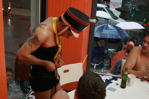 As I walk onto the street where Art in General is housed, I notice a crowd standing around the gallery. It is all men-- and they are not budging. They are fixed on the activity going on inside the small raised space that is exposed to the street. This is I’ll Raise You One, the easily provocative performance art piece in which people (men and women) play strip poker in full view of passersby. Zefery Throwell, who organized the naked protest in Wall Street titled, Ocularpation: Wall Street (foreshadowing the real social movement of Occupy Wall Street) brought the analogy back for a reboot: he asserts that participating in our economic system is akin to playing strip poker. Certainly, this fits the bill, since cunning and a lucky draw can net you everything, while a flip of the script can leave you with