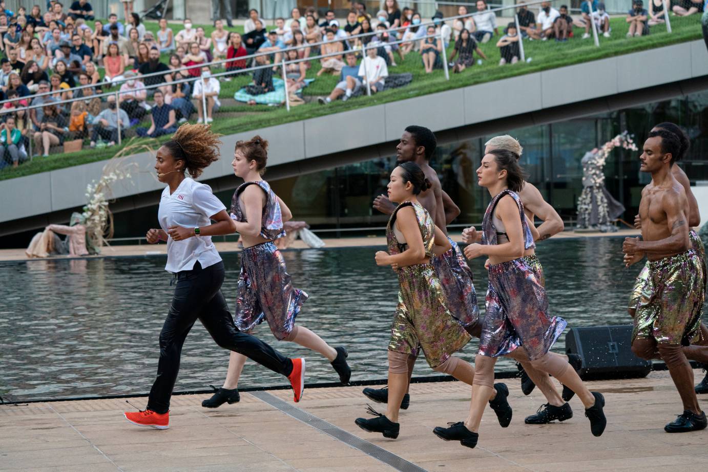 Who tells our American story, and what is told? Ultimately, who do we want to author our history? On this occasion in July, choreographer Andrea Miller decides. Around and in the peaceful Lincoln Center reflecting pool, Miller creates a powerful spoken and movement narrative for 25 civilian portraitists who represent many of America's ancestries, that grapples with the subjects of death, queerness, discrimination, gender equality, broken promises, land, respect, sustainability, community. Intersecting the succession of six stories on the evening this reviewer attended, the GALLIM company of 12 dancers, dressed like the sequined skin of fish, mark the territory. Akin to soldiers marching to battle, the dancers' shuffling cadence provides the level undertone for the demanding narratives. While entering smooth water and climbing grass stairs, the dancers link the narratives.