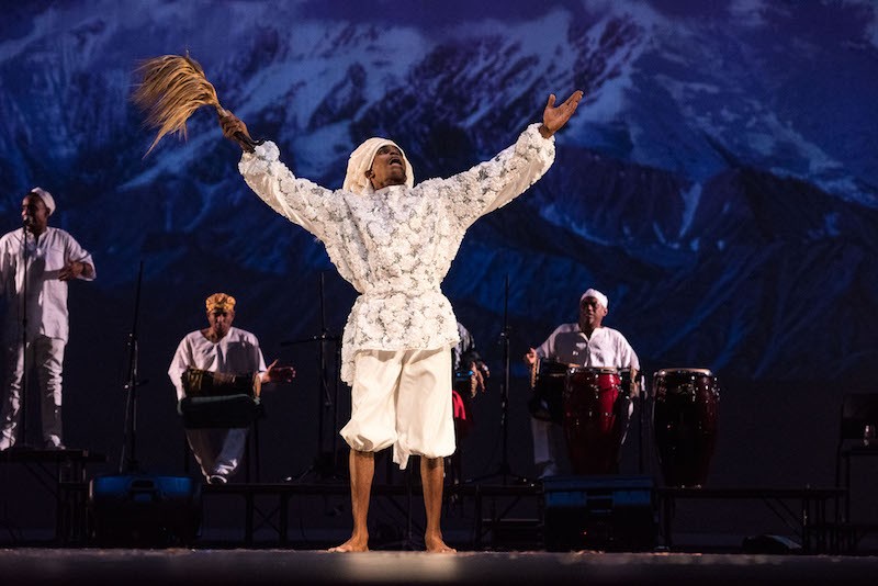 Siete Mares, presented by Oyu Oro Afro Cuban Experimental Dance Ensemble, dives into Orisha mythology through drama and dance. Accompanied by a large cast and guests from Santiago, Cuba, this work is the third of the Patakin series directed, choreographed, and written by Danys “La Mora” Perez. The Patakin series shares the oral tradition of Cuba through the rhythm of the drums. This practice is derived from the Yoruba culture of West African and includes song and movement.