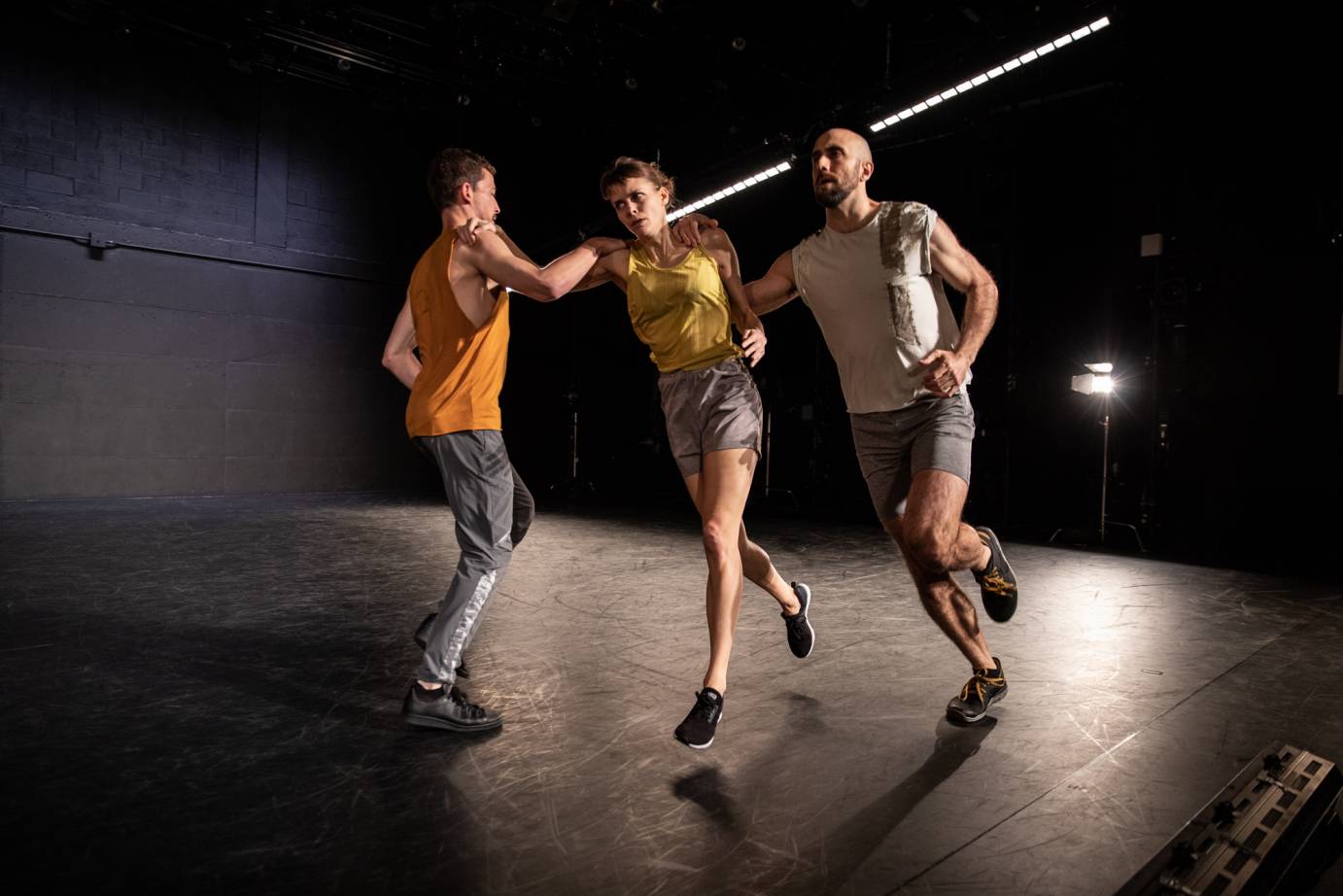 At times, the three congregate in partnered phrases, which range from meditative to restless. Like a gymnast on the parallel bars, Johnson dead-lifts himself to gaze over his shoulder, using the bodies of Kotze and Crossman as support. Kotze sinks into Johnson’s arms, extending one leg. Ostensibly, these moments are for catching their breath, but they also plug in to the power of communal energy. They give and they take, creating fleeting equipoises in the process.