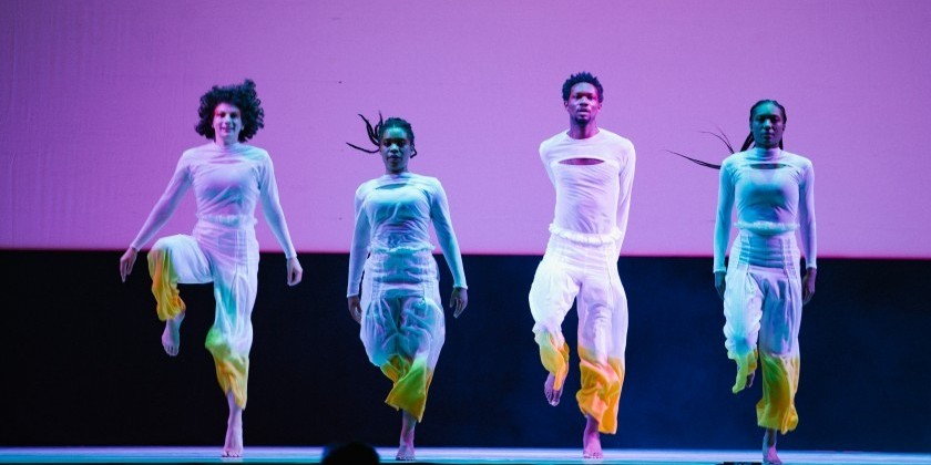 In white tops and pants with yellow, dip-dyed legs, four dancers lie prone on the stage, like beams from a sun at half-mast. Marshall and then the rest ripple through their bodies until they make their way to standing. Yoga-esque poses like a three-legged dog and various warriors eventually coalesce in walking in a circle with the occasional loose hip swing—the essence of shout tradition. Later, as anticipated by a pumping fog machine, the quartet asserts themselves as individuals with twittering feet and slicing limbs. Save a blistering, can’t-take-your-eyes-away solo of punchy weight changes from Damani Alfreida, the performance registers as no-stress from top to bottom with calm facial expressions and relaxed feet.