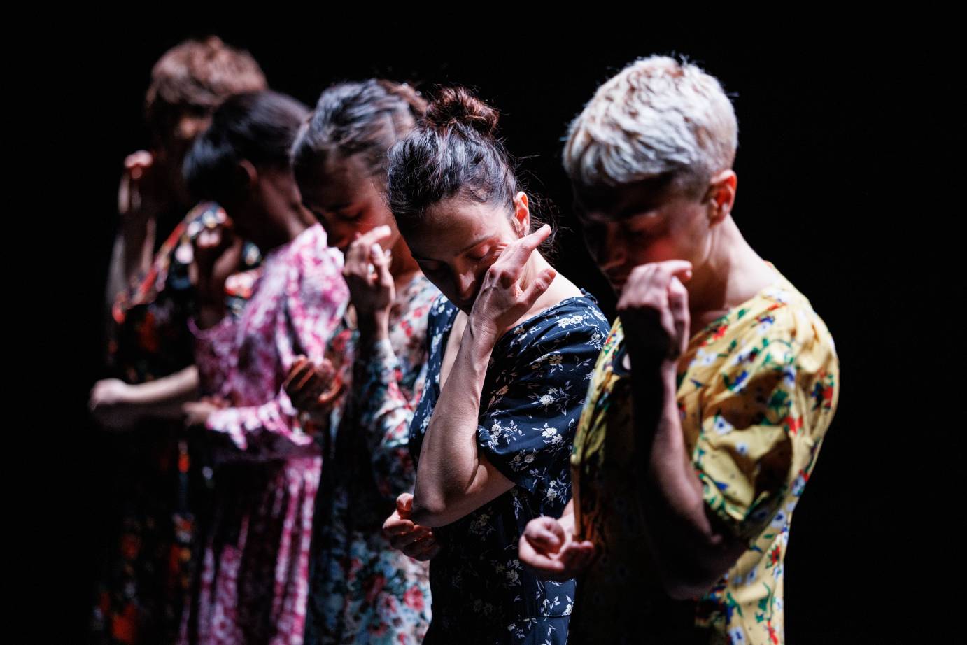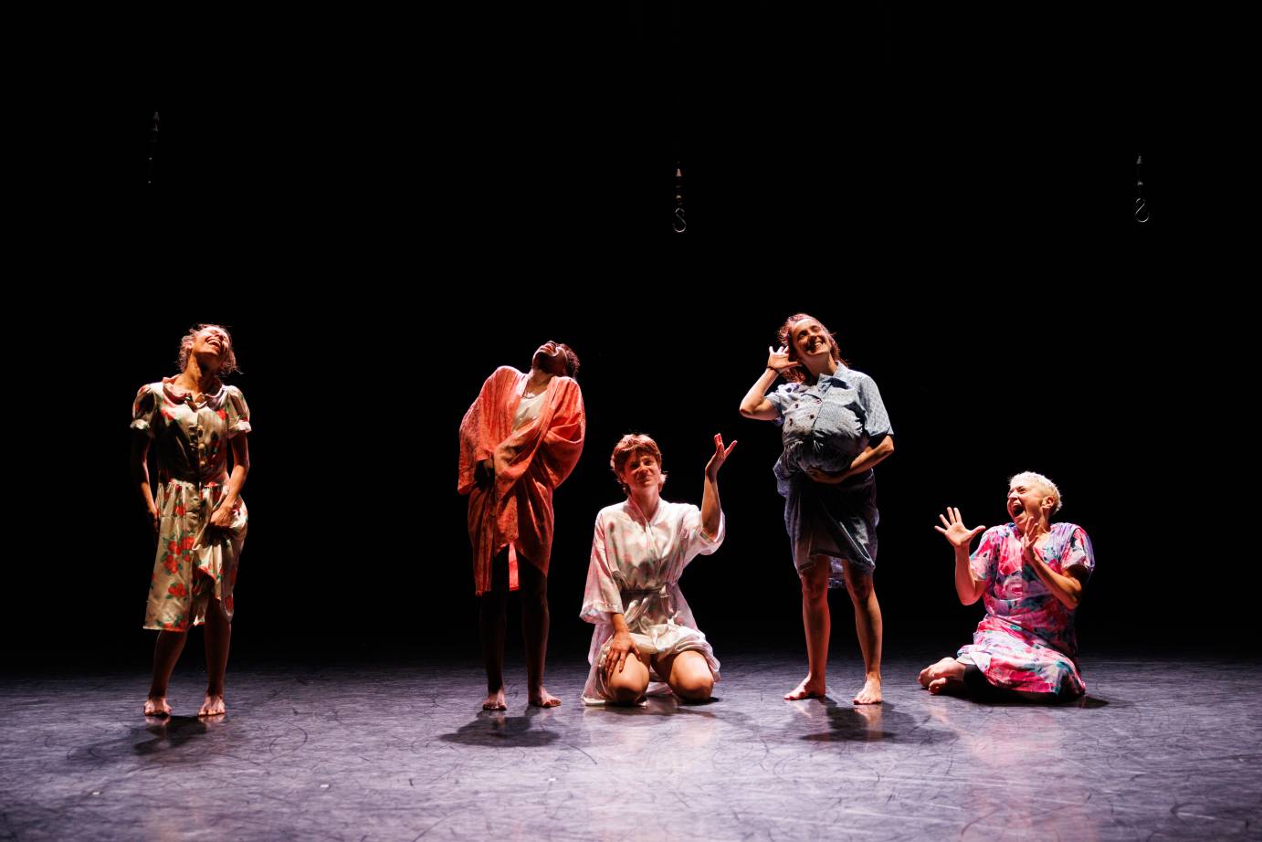 In tandem with the artists' compelling performances, dresses continuously amplify the space. Amid a multitude of costume changes, Ka invites us to view womanhood from alternating angles, represented through a wide selection of garment styles: modest, flowing, fitted, long, short, floral, solid, silky, to name a few. The dresses are not only worn, but partnered with, passed around, hung on hooks, raised to the ceiling, flung about, and bundled up. Each dress ripples and breathes energetically, and I am entranced by how the quintet captures so many characters.