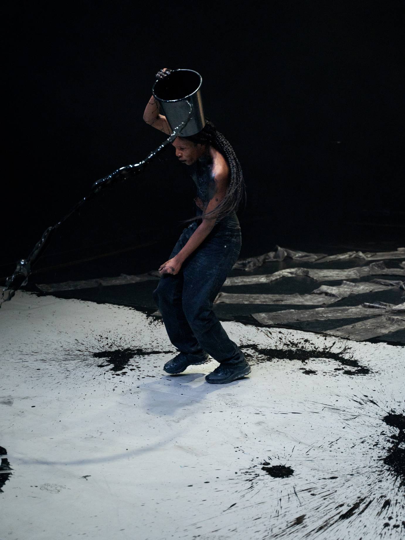 Dancer and choreographer Cherish Menzo, who is based in Brussels and Amsterdam, wields darkness as a conduit to radically reimagine Black presences and futurities. Her DARKMATTER, an extended duet for Menzo and Camilo Mejía Cortés, unspools with thick tension amid an atmosphere destabilized by distorted light, sound, and perception. Slick black paint anoints bodies and stage alike; black latex platform boots and flashes of gold teeth gleam amid ever-shifting landscapes of writhing flesh.