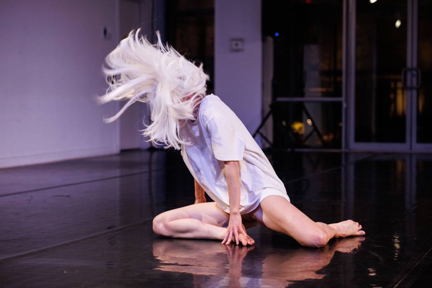 As she works her way through a selection of color-coordinated oversized t-shirts and dramatic bob wigs in luminous pink, white, green, red, and black, Childs is a stealthy, ethereal creature whose textural patience and specificity run the gamut: dry or quirky, constructed or deflated, delicately wrought or meticulously explosive. She quivers and skips, slouches and folds, slithers and spins with supreme agility and command of scale, moved from within as she navigates among the glowing pleasure of musical lyricism, the hissing static of recorded applause, and dark, enveloping clouds of rumbling bass. Her fantasia is a world of her own, delivered from deep within to vibrate through and beyond the original film’s imaginative range.