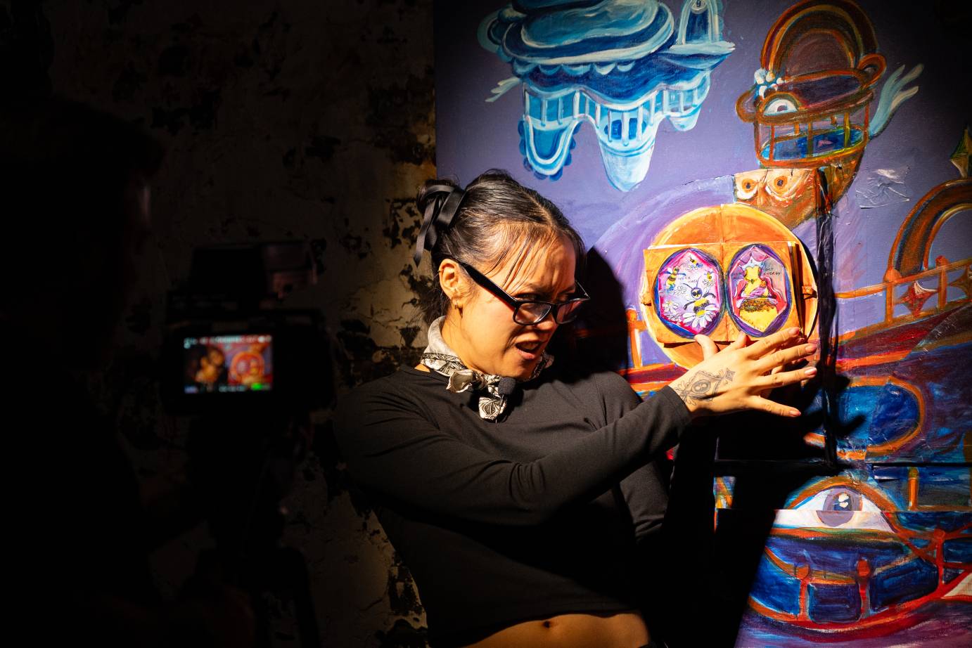 Likewise, visual theatre artist and introspective hypnosis practitioner Maria Camia crafts an intricate allegorical world from a stunningly intricate pop-up painting installation for a pair of finger puppet protagonists in Maria Reads a Book: Higher Eyes on Aricama. Live video, songs, and piano accompaniment color Camia’s garrulous dialogue and narration as she weaves themes of presence, power, and collective liberation from the infinite possibilities of cardboard, paint, magnets, and string — a feat of imagination.