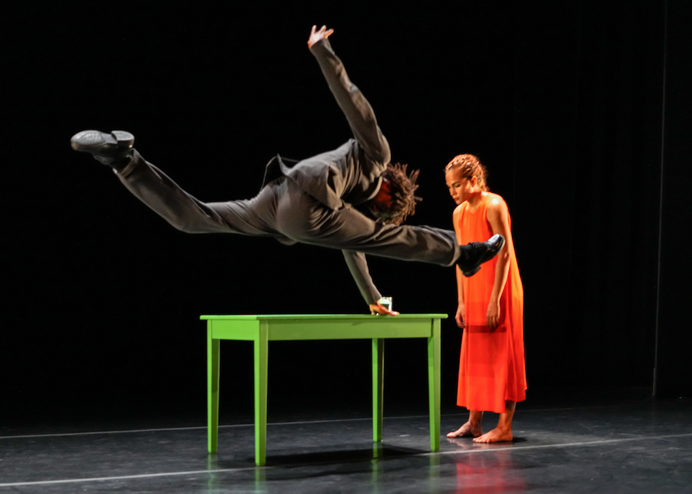 Ek's woman with water, followed. This piece featured Delgado, a mysterious man in black, and the passionate, Dunia Acosta, dressed in bright orange. Beginning alone on stage, Acosta wrestles with a green table. Fascinated and tormented by the table, she hangs onto it from behind. As she presses her flexed feet forward from underneath it, her body appears to be cut in two, as if severed by a magician. Delgado then enters pushing the table across the stage with Acosta trapped underneath. As she rolls swiftly along with his motion, it seems as if the stage is abruptly tilting on an incline.