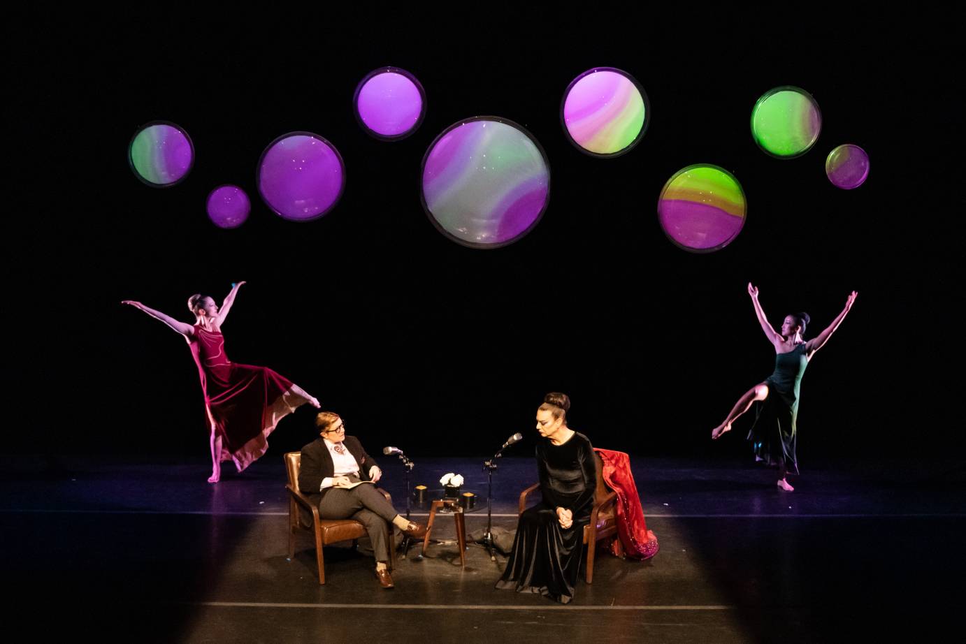 Drama infuses every aspect of Graham’s art. Yet, even so, this conversation would appear static if Move had not recruited two authentic Graham dancers to enliven the scene with their visceral performances. Catherine Cabeen and PeiJu Chien-Pott first appear as acolytes crowning Move’s outsize figure with their hands (and affirming Graham’s artistic stature). Then the two women take turns portraying the characters under discussion. Chien-Pott scrabbles on her knees and draws a wriggling serpent from deep within herself as Medea. As Clytemnestra, she wields a primitive axe, seeming to kick down doors as she advances. Cabeen assumes elongated poses that seem to connect heaven and earth, radiant in her stillness as St. Joan. Emerging from darkness to swirl around the interview taking place centerstage, these dancers seem to have issued from Graham’s thoughts.