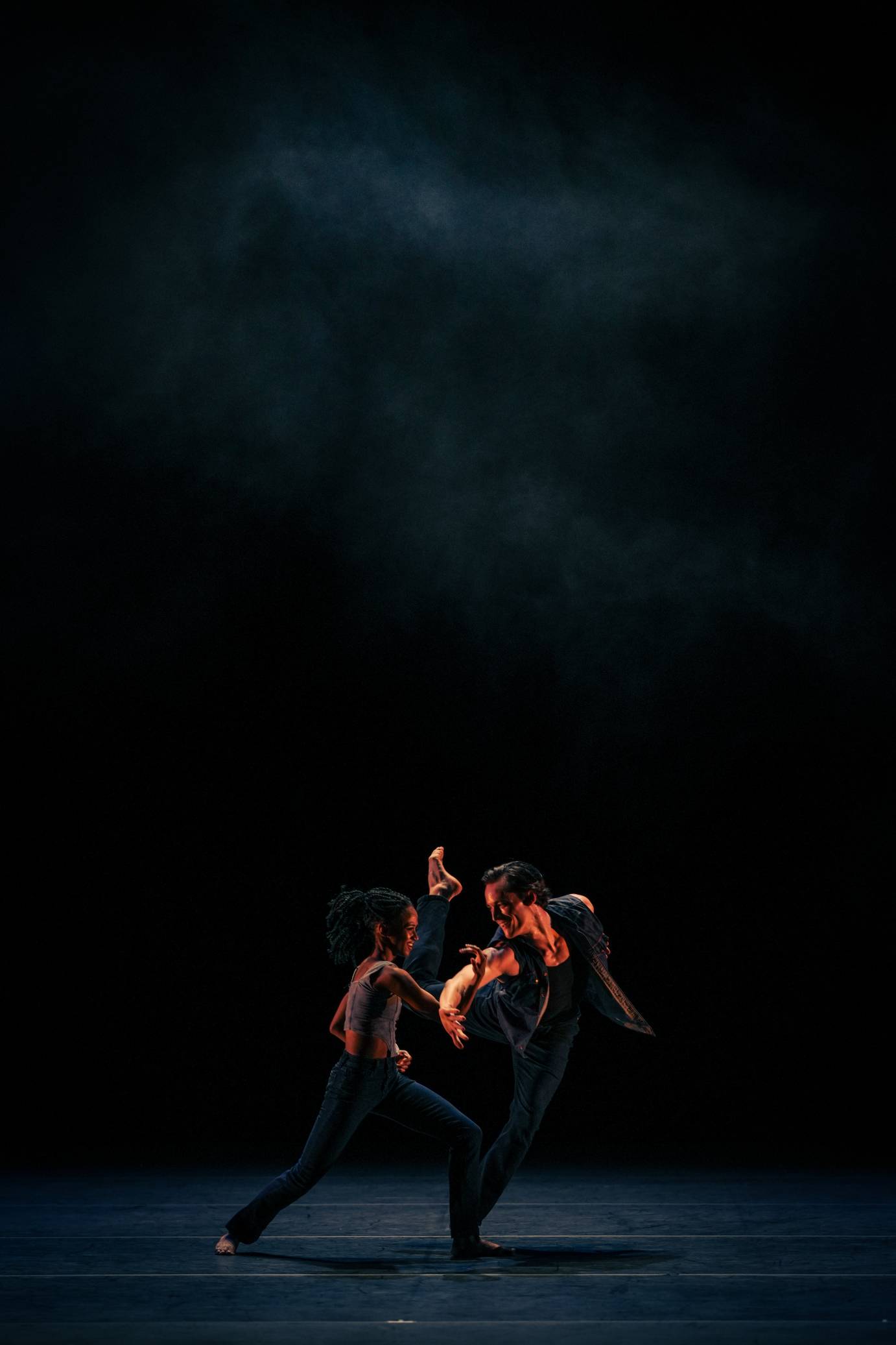 Leslie Andrea Williams sets a tone of defiance as the piece opens, her body alternately tense and yielding. She turns a shoulder warily toward us, making herself a smaller target. Sinking slowly as if someone were forcing her down, she rises again and feigns nonchalance. Alessio Crognale-Roberts faces us coolly with his thumbs tucked in (shades of Rodeo), but his confidence wanes as he begins to weave twisting side to side as if trying to avoid unpleasantness. He half-conceals his face behind a flexed bicep, but then softens as his hand turns outward. At the outset of his cameo, Lloyd Knight walks into an invisible obstacle that forces him to retreat, and everything that follows comes in reaction. Recalling Alvin Ailey’s Revelations, Knight struggles to maintain his balance close to the ground, as powerful forces twist and overthrow him. In We the People, living is a martial art. A smoky haze hangs over the stage, adding visual drama; and the bouncy folk score by Rhiannon Giddens gives way to stretches of silence that frame the soloists. Presumably Roberts felt constrained by the rhythm. Those silences haunt the piece, adding isolation and a yearning for freedom to its themes.