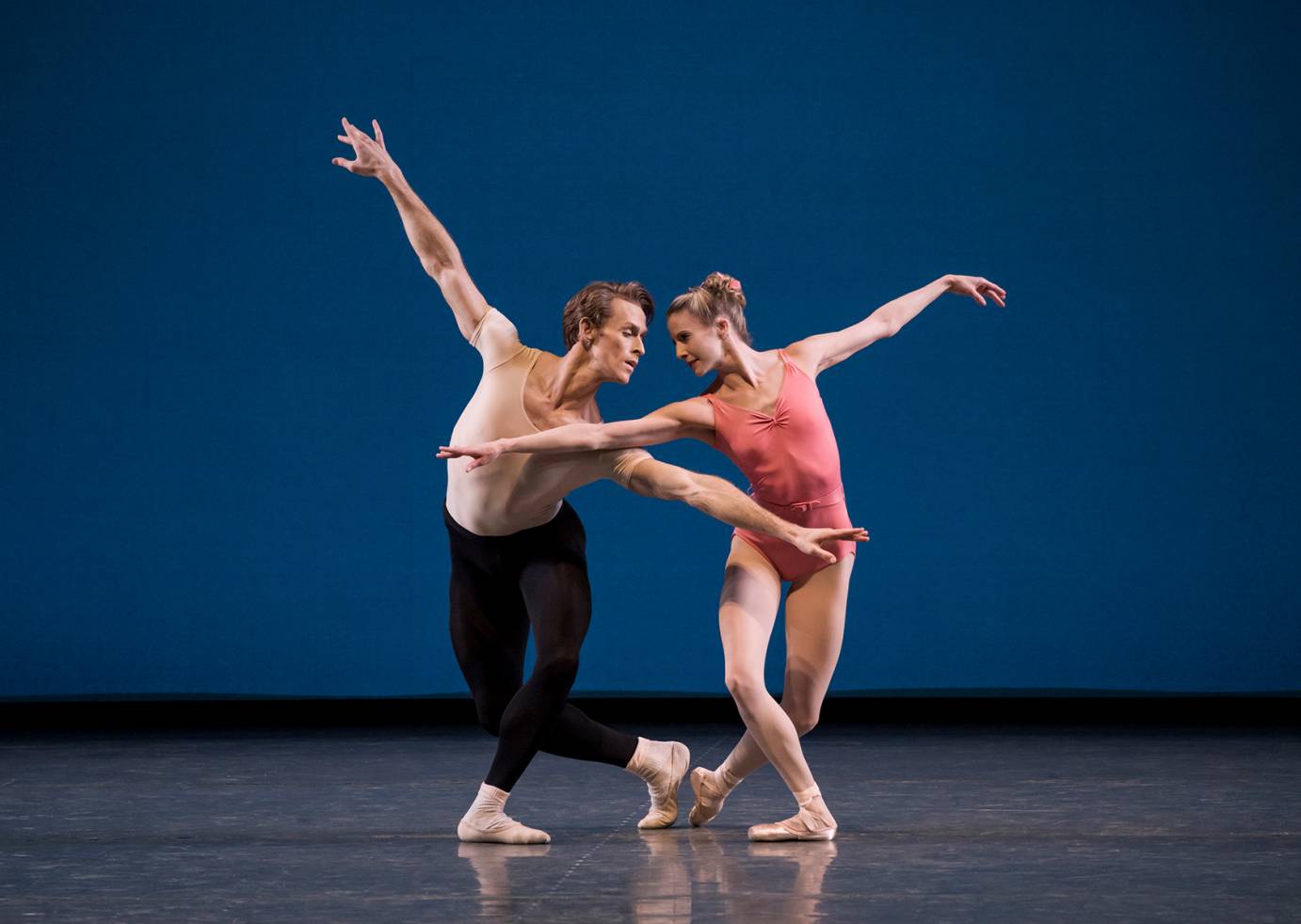 Diagonals form and dissolve, and lines juxtapose circles. Jumps explode in perfect unison. Syncopation and elements of jazz inform the music as well as the choreography. In contrast to the excitement of this futuristic architecture, the duet explores more delicate patterns. It could be set in a Japanese garden. Sterling Hyltin and Adrian Danchig-Waring choose to stylize their movement and thus create a plasticity that removes a heartfelt human connection. Their interpretation is valid and teaches me to look at the pas de deux with fresh eyes.