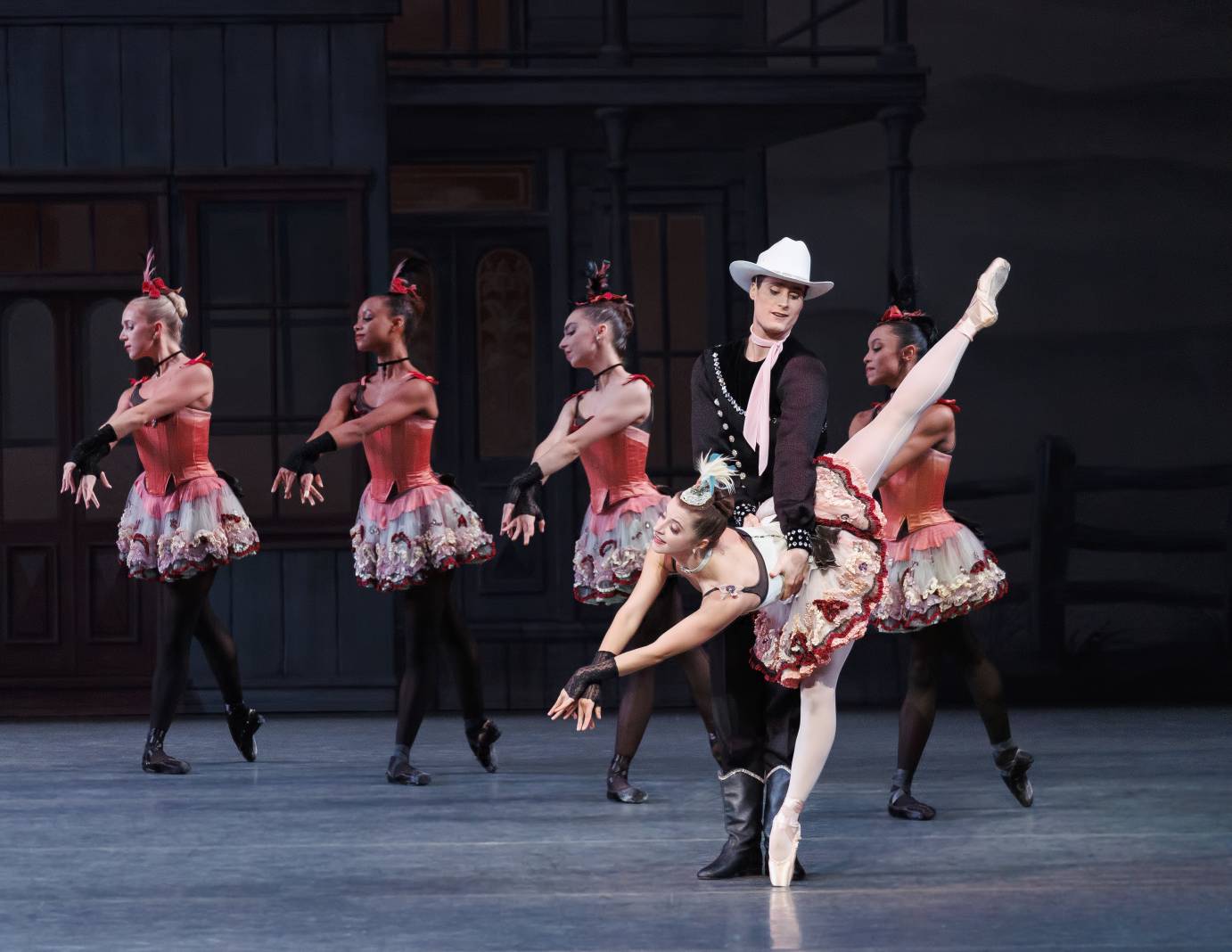 Indiana Woodward, Aarón Sanz, and the Company in George Balanchine’s Western Symphony. Photo credit: Erin Baiano