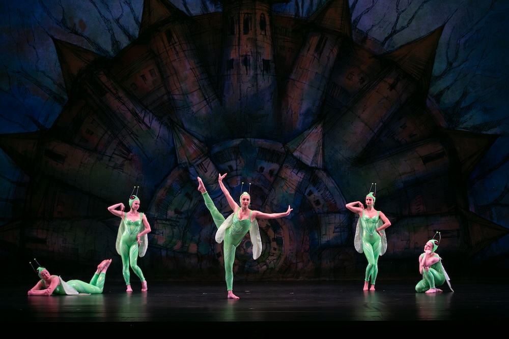 Perhaps the castle nods to the reality that females are royalty – the stronger sex in this insect species. The stage bursts into flirtation and fury, as Taylor introduces the males. In their black and teal costumes, they mimic flies. The males soar and strut with bravado and puffed chests. My eye goes to Patrick Gamble, his suspended, lofting jumps bringing the illusion of floating.