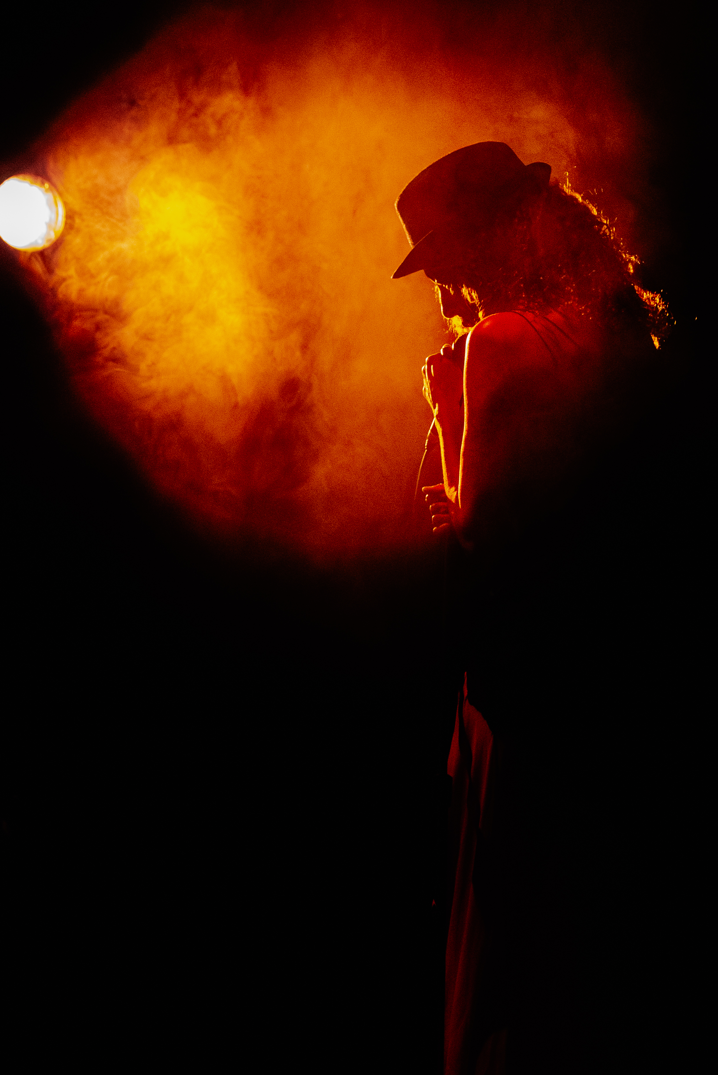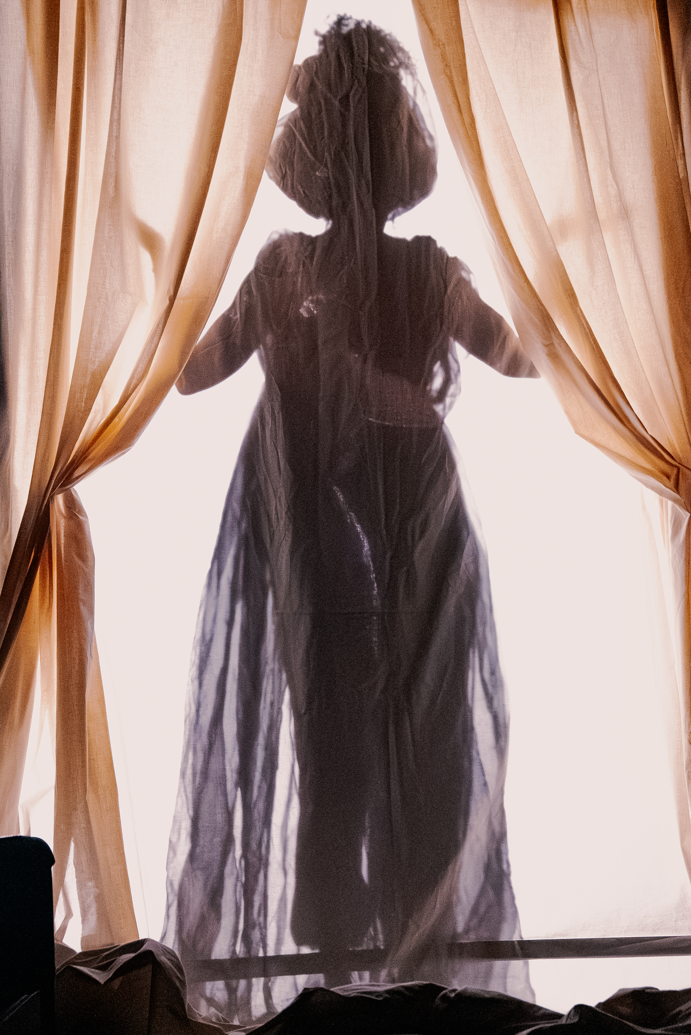 The silhouette of a woman wearing the suggestion of a petticoat emerges on the curtain screen. She bends over in silence, struggling to tame her wild curls beneath a head wrap. From this shadow play, though devoid of color, we understand her to be a Black woman. The skirt suggests a colonial space where European, African, and Indigenous cultures meet: the very definition of Creole. She reaches her index finger to her lips, miming a shhh, as if we should not tell anyone what we have seen. Electric strings reverberate beneath the action.