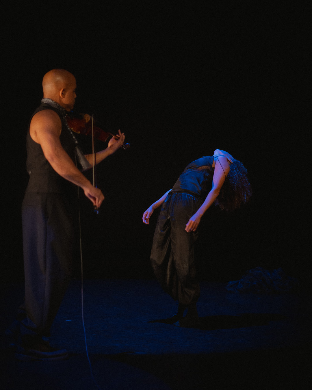 In another moment, Bernard Roumain enters looking like a futuristic figure from a science-fiction film. He holds his violin's bow in his teeth and plays the instrument with his fingers like a heavy metal guitarist. I never knew a violin could sound like that, even an electric one. He feels his neck for a pulse, a theme for both artists throughout the piece, as if wondering whether or not they are truly alive. Later, the tap of his foot introduces a hoedown, which turns into a ballad, then a lament.