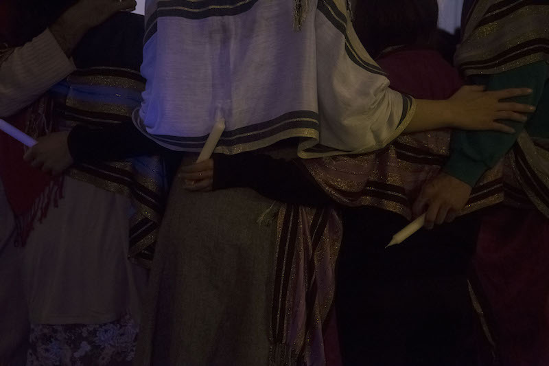 Meyers soon assumes the role of a Jewish mother. In a convincing accent, he says, “this is my dream Shabbat,” and gives the uninitiated his understanding of the tradition: It’s a day of rest where time stands still. Though this Shabbat is far from traditional, we do perform some of its rituals. We light tea candles and arrange them unintentionally in a lopsided heart while Meyers recites a blessing. We sip from a communal cup of wine and then take turns washing our hands in a bowl as another attendee pours water over them.
