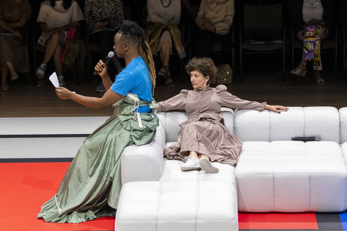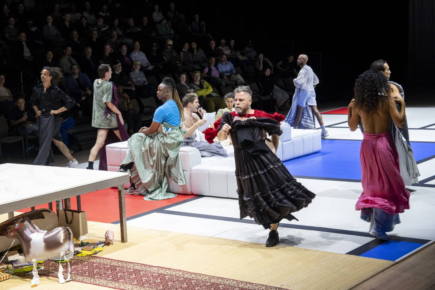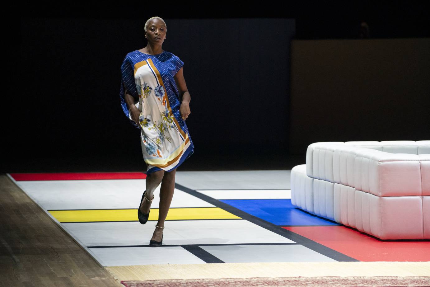 Modeled on a high-fashion runway show, Harrell transforms the cavernous Armory Drill Hall into a space at once monumental and intimate, with seating risers running the length of the performance arena on opposite sides — we face each other as we face the stage, our faces lit from below by the reflection of the often starkly uniform flood of light. The huge rectangle of Mondrian-inspired floor serves as a centerpiece, its sleek lines and geometric blocks of primary colors set with symmetrical banks of chunky white couches and interrupted at its center by a domestic tableau: organic fiber floor, carpet runner, and large marble table perched atop a spill of children’s toys. A small balloon in the shape of a horse floats on dangling legs made of streamers, reined to the table by a thin ribbon. These touches serve as a visual reminder: don’t take the mess too seriously, and remember always what it means to play.